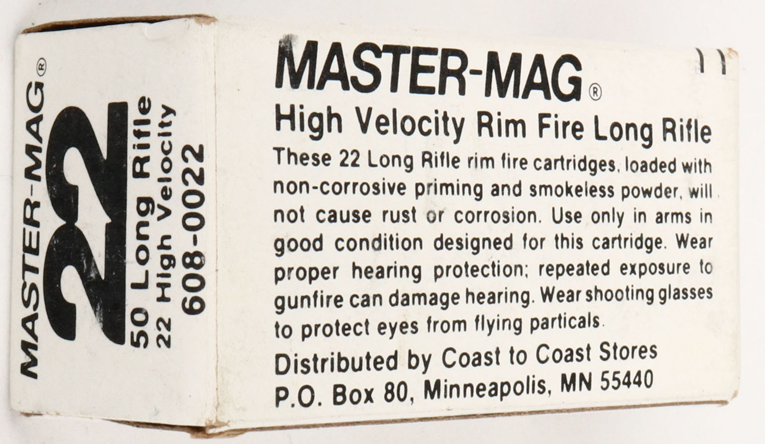 Coast to Coast, Master-Mag, .22 Long Rifle, High Velocity, RHWeb: CTC-1 LR-3, Full, 1pc. White & black box, box is solid with excellent color, very minor age soiling & corner wear, edges are mostly crisp, end flaps are solid, ammo is minty. Grade: Excellent + - Value: 4 to 20