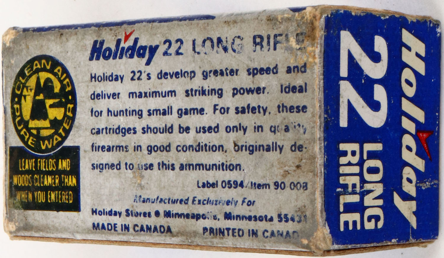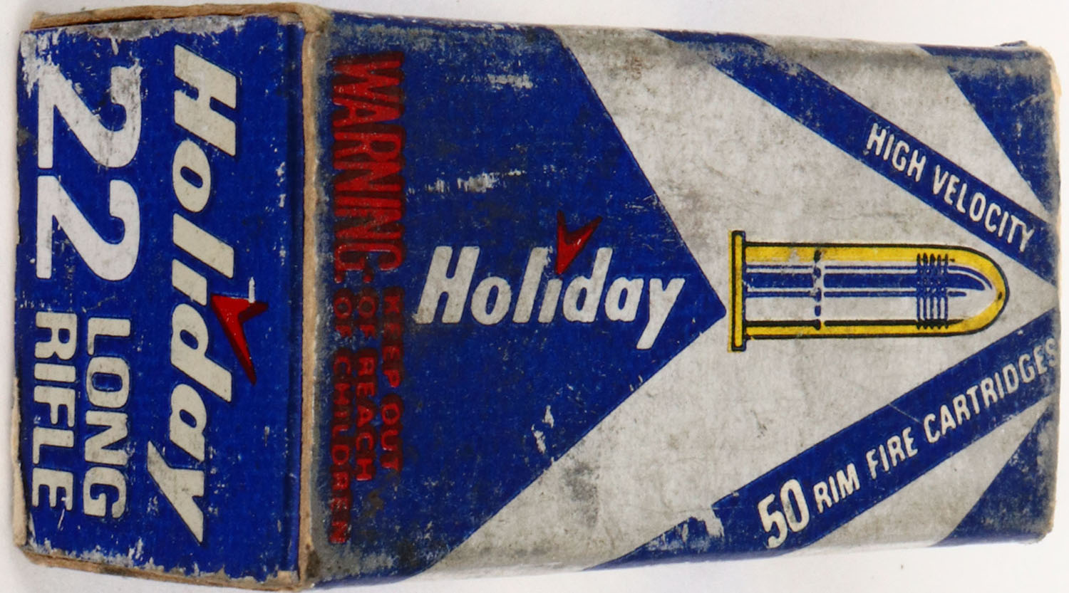 Holiday, .22 Long Rifle, High Velocity, RHWeb: HS-1 LR-1, Full, 1pc. Blue & silver box, box is solid with excellent color, shelf wear, minor corner wear, very minor edge wear, end flaps are solid, ammo is excellent. Grade: Excellent + - Value: 10 to 50