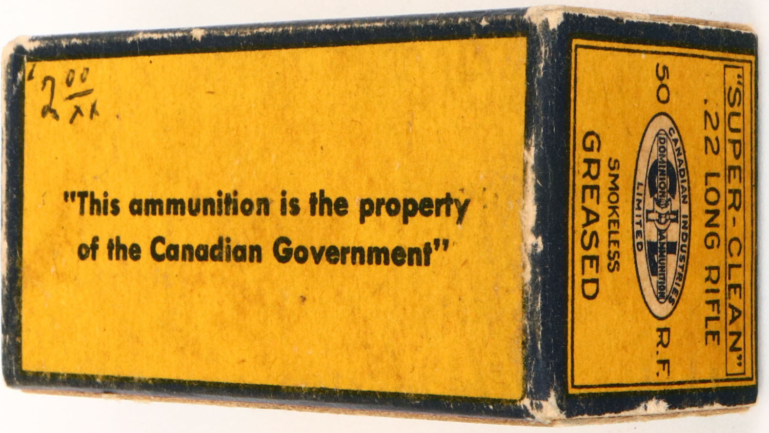 C.I.L., Super-Clean, .22 Long Rifle, Smokeless Greased, RHWeb: CIL-2 LR-1c (TT-59 on end flap), Full, 1pc. Yellow & blue box, box is solid with very good color, age soiling, edge & corner wear, end flaps are solid, ammo is very good. Grade: Excellent + - Value: 4 to 20