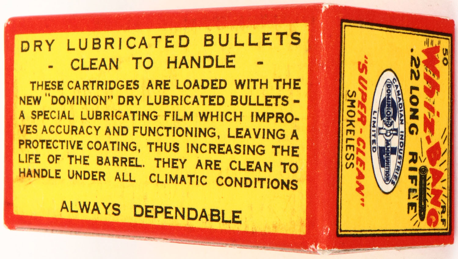 C.I.L., Whiz-Bang, .22 Long Rifle, Super-Clean, RHWeb: CIL-2 LR-6, Full, 1pc. Yellow red & blue box, box is near mint with minty color, only very minor corner wear, edges are crisp, end flaps are solid, ammo is excellent. Grade: MINT - Value: 40 to 120