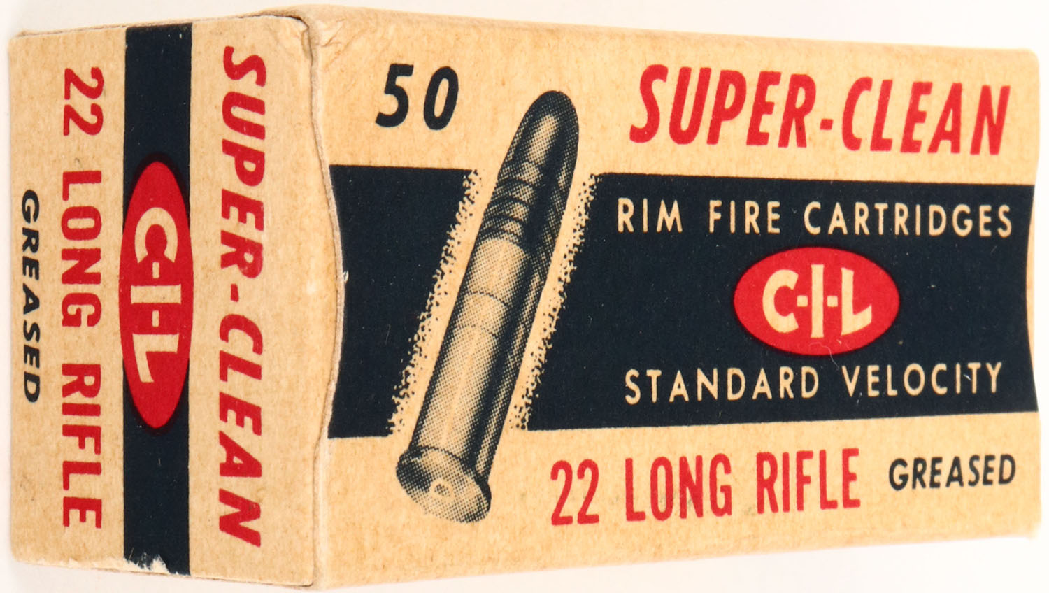 C.I.L., Super-Clean, .22 Long Rifle, Standard Velocity, RHWeb: CIL-3 LR-4, Full, 1pc. Buff & blue box, box is solid with excellent to minty color, one small corner ding on top back corner, corners otherwise sharp, edges are crisp, end flaps are solid, ammo is very good to excellent. Grade: Excellent ++ - Value: 8 to 40