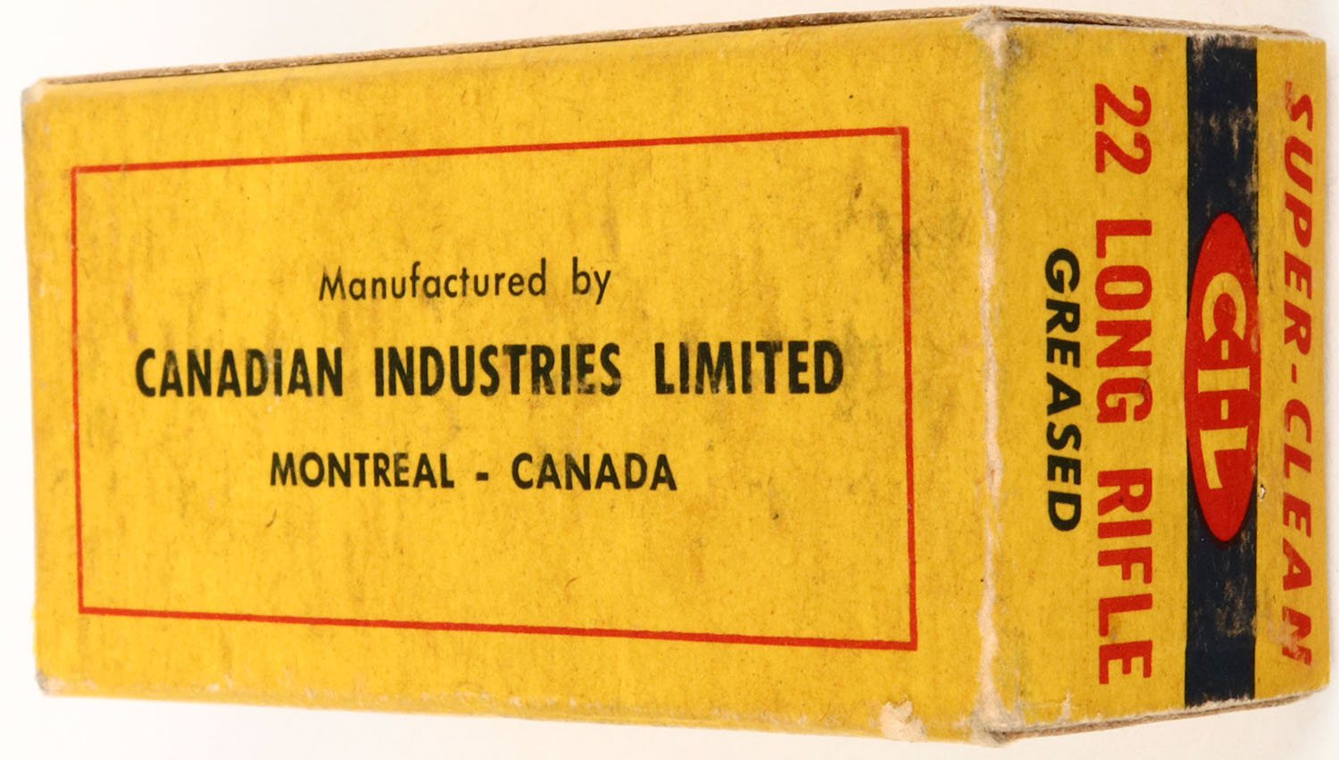 C.I.L., Super-Clean, .22 Long Rifle, Standard Velocity, RHWeb: CIL-4 LR-4, Full, 1pc. Yellow blue & red box, box is solid with very good to excellent color, some age soiling, very minor corner wear, edges are mostly crisp, end flaps are solid, ammo is very good. Grade: Excellent + - Value: 4 to 20