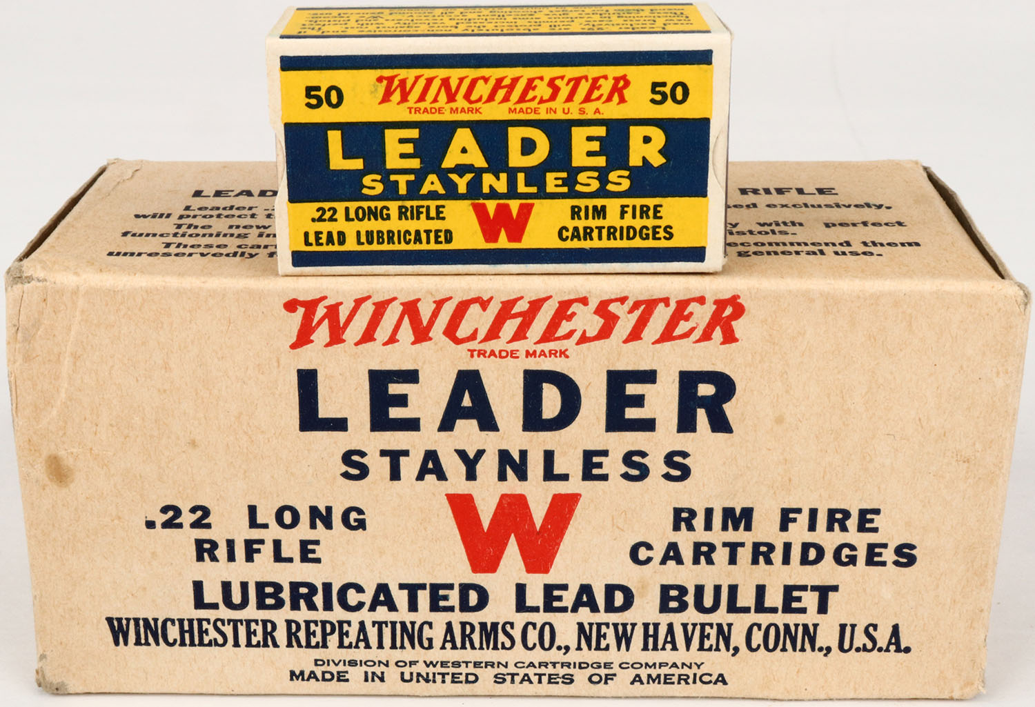 Winchester, Leader, .22 Long Rifle, Staynless, Full, 500rds. 1pc. Buff brick with blue & red printing, brick is solid with excellent to minty color, corner wear, edges are mostly crisp, end flaps are rigid, inside boxes are minty. Grade: Excellent ++ - Value: 50 to 150