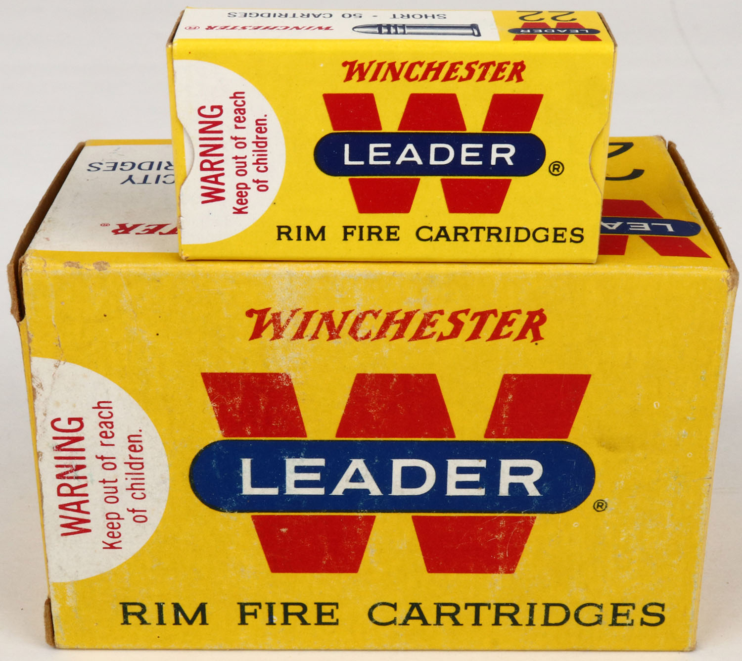 Winchester, Leader, .22 Short, Standard Velocity, Full, 500rds., 1pc. Yellow red & white brick, brick is solid with excellent color, only very minor age soiling & corner wear, corners are mostly sharp, edges are crisp, end flaps are rigid, inside boxes are minty. Grade: Excellent ++ - Value: 50 to 150