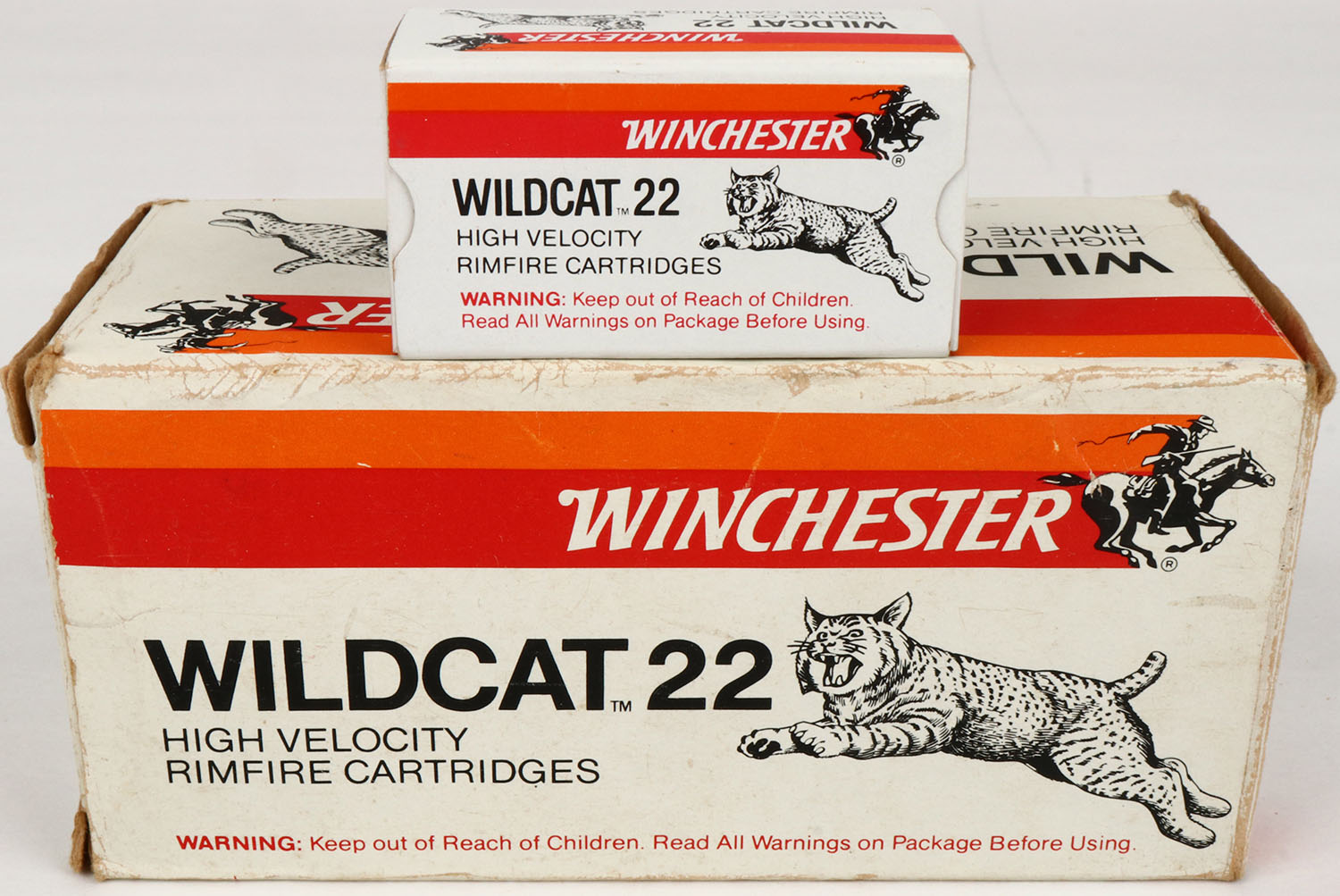 Winchester, Wildcat, .22 Long Rifle, High Velocity, Full, 500rds. 1pc. White brick, brick is solid with excellent color, some edge & corner wear, inside boxes are mint. Grade: Excellent + - Value: 40 to 120