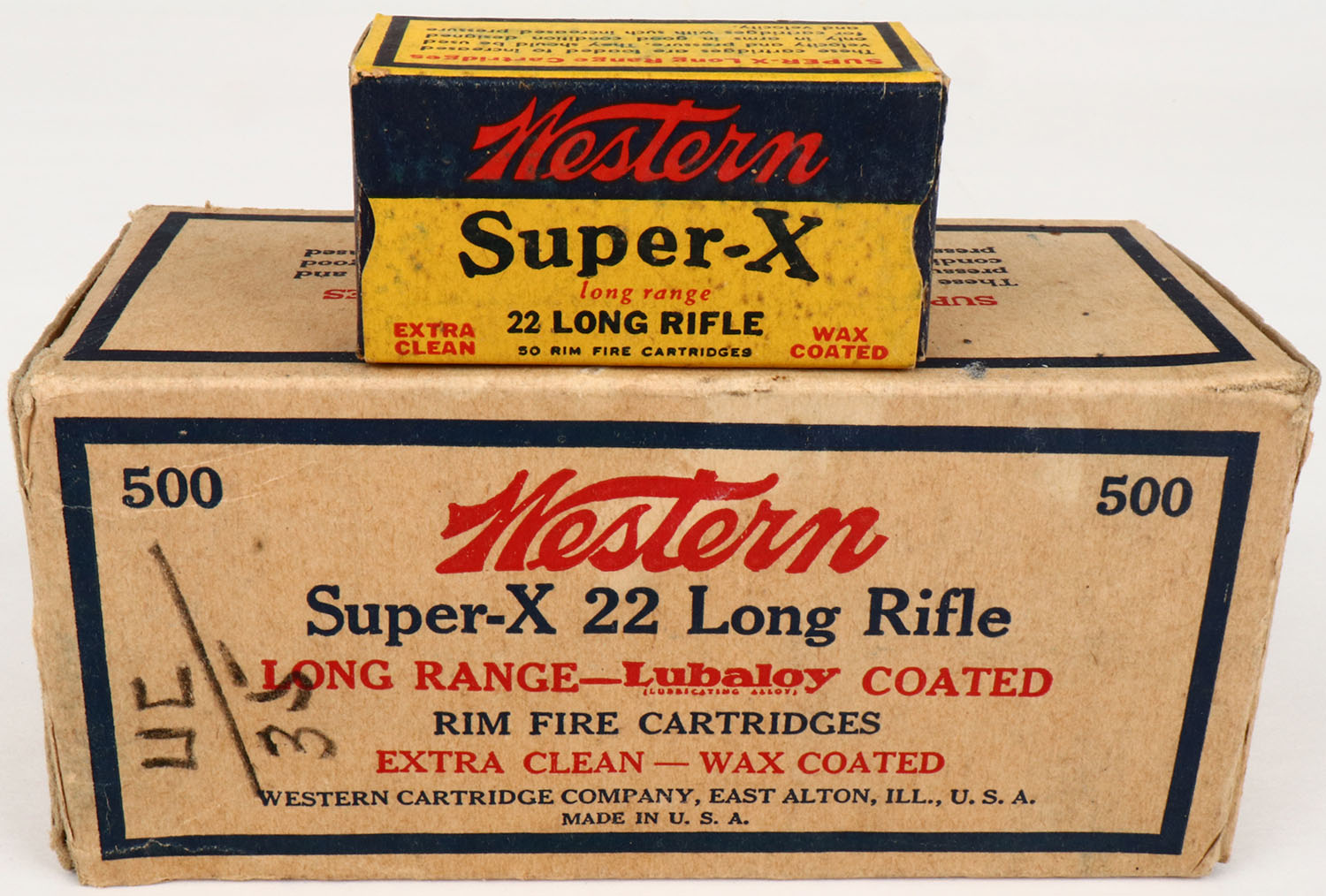Western, Super-X, .22 Long Rifle, Long Range - Lubaloy Coated, Extra Clean - Wax Coated, Full 500rds. 1pc. Buff brick with blue & red printing, brick is solid with some age soiling, some edge & corner wear, top has been written on, inside boxes are very good. Grade: Excellent - Value: 50 to 150
