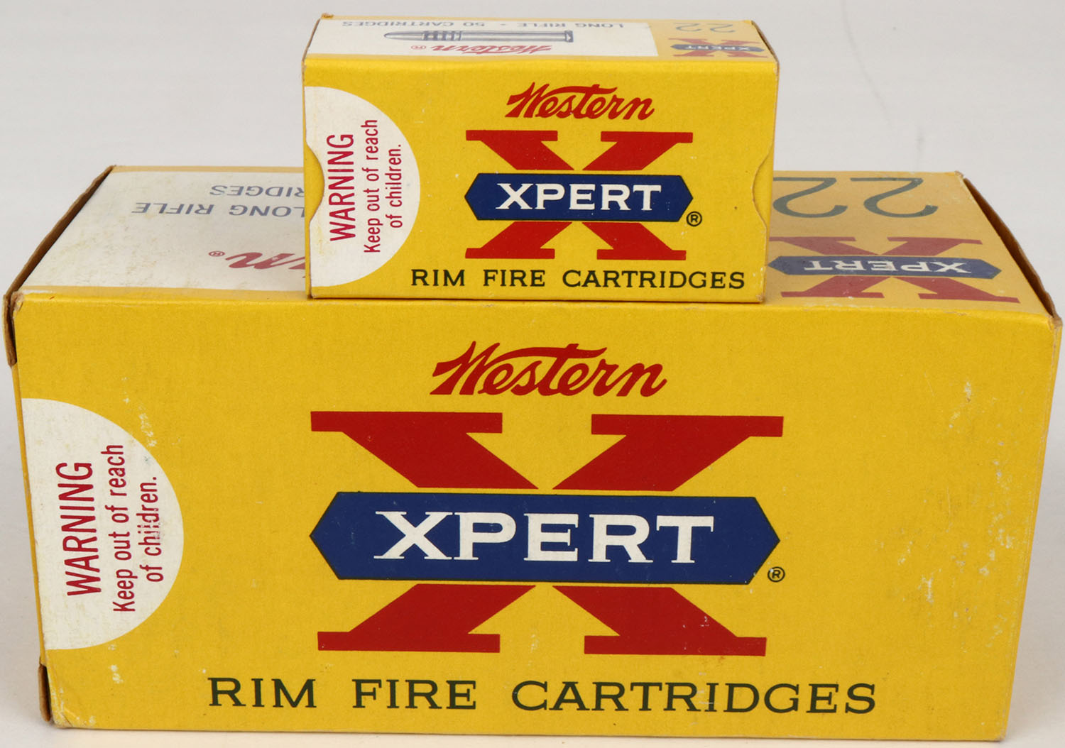 Western, Xpert, .22 Long Rifle, Special Lubricant, Full 500rds. 1pc. Yellow white & red brick, brick is near mint with minty color, only very minor shelf & corner wear, corners are mostly sharp, edges are crisp, end flaps are rigid, inside boxes are minty. Grade: Excellent ++ - Value: 50 to 150