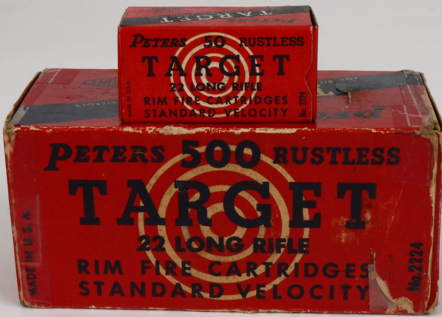 Peters, Target, .22 Long Rifle, Standard Velocity, Full, 500rds. 1pc. Red black & white brick, brick is solid with very good to excellent color, some age soiling, box has tape on ends, corner & edge wear, end flaps are mostly rigid, inside boxes are excellent. Grade: Very Good ++ - Value: 50 to 150