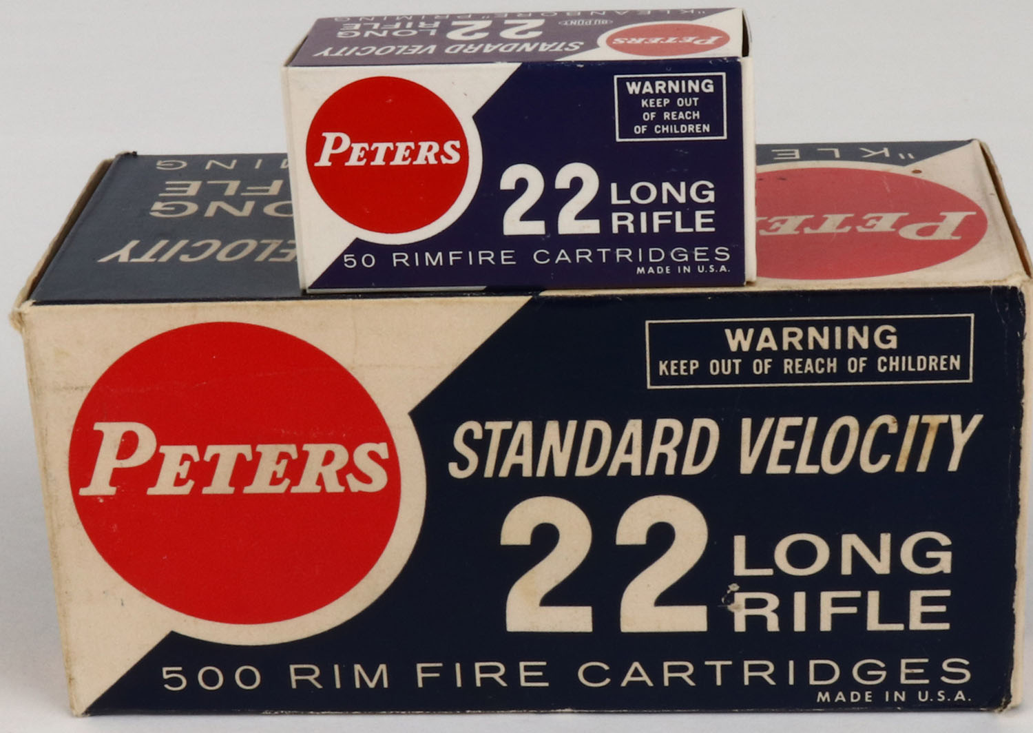 Peters, Target, .22 Long Rifle, Standard Velocity, Full, 500rds. 1pc. Blue red & white brick, brick is solid with excellent color, brick has tape on left end, very minor age soiling, some corner & edge wear, end flaps are rigid, inside boxes are excellent. Grade: Excellent + - Value: 50 to 150