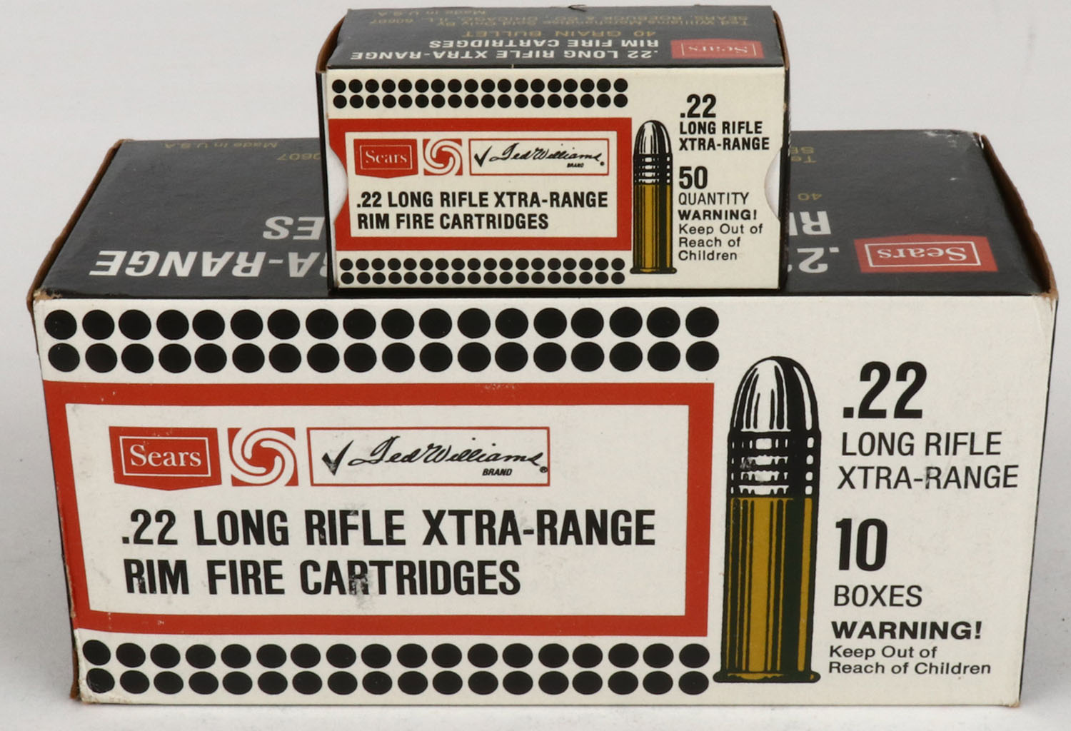 Sears, Xtra-Range, .22 Long Rifle, 1pc. Full, 500rds. Black white & red brick, brick is solid with excellent color, very minor corner wear, edges are crisp, end flaps are rigid, inside boxes are minty. Grade: Excellent ++ - Value: 40 to 120