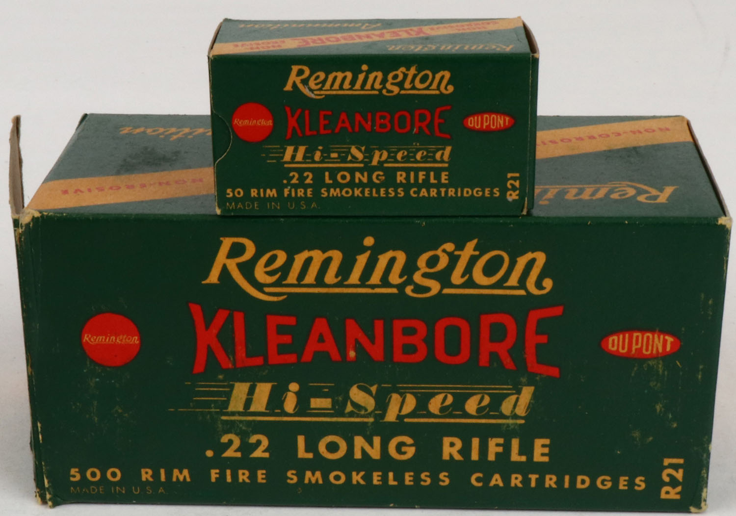 Remington, Kleanbore Hi-Speed, .22 Long Rifle, R21, Full, 500rds. 1pc. Green white & red brick, brick is solid with excellent color, very minor age soiling & shelf wear, minor corner wear, edges are crisp, left end flap is torn, inside boxes are minty. Grade: Excellent - Value: 50 to 150