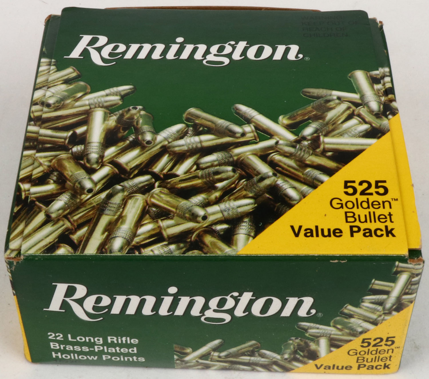 Remington, Golden Bullet, .22 Long Rifle, Brass-Plated Hollow Point, 1pc., Full, 525rds. Green & yellow bulk box, box is mint with minty color, sharp corners, crisp edges, rigid top flaps, ammo is minty. Grade: Mint - Value: 30 to 60