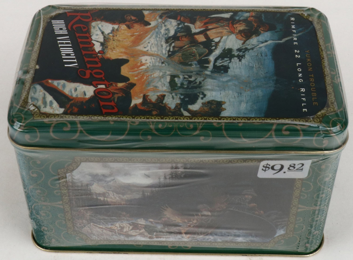 Remington, Limited Edition Collectors Tin, .22 Long Rifle, High Velocity, 1pc. Full & Sealed, 400rds. Hinged tin features ''Yukon Trouble'' Classic Remington advertisement artwork, Tin is mint. Grade: MINT - Value: 50 to 150