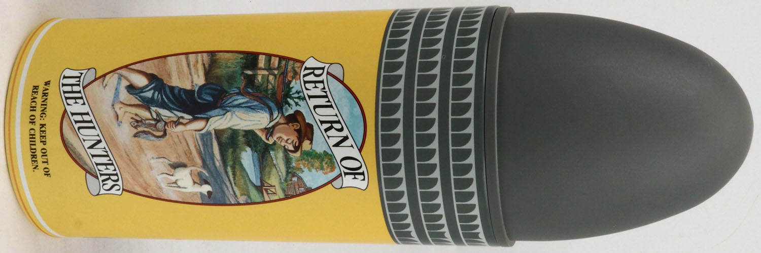 Remington, ''RETURN OF THE HUNTERS'', Full, 350 Long Rifle rounds (golden bullet?) in a tin the shape of a .22 bullet, ammo is sealed in plastic bag inside, tin is solid with minty color, no rust. Grade: Mint - Value: 50 to 150