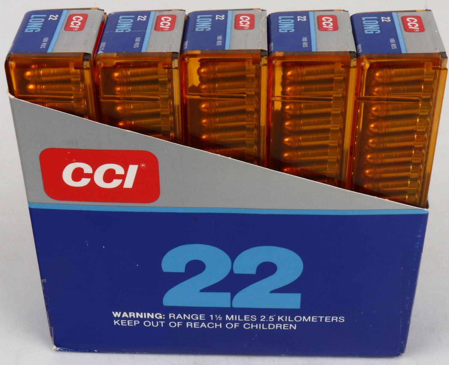CCi, .22 Long, Full, 500rds. 1pc. Blue silver & red display brick, brick is solid with excellent to minty color, very minor edge & corner wear, bottom has been taped for support, inside boxes are all sealed and minty. Grade: Excellent ++ - Value: 50 to 100