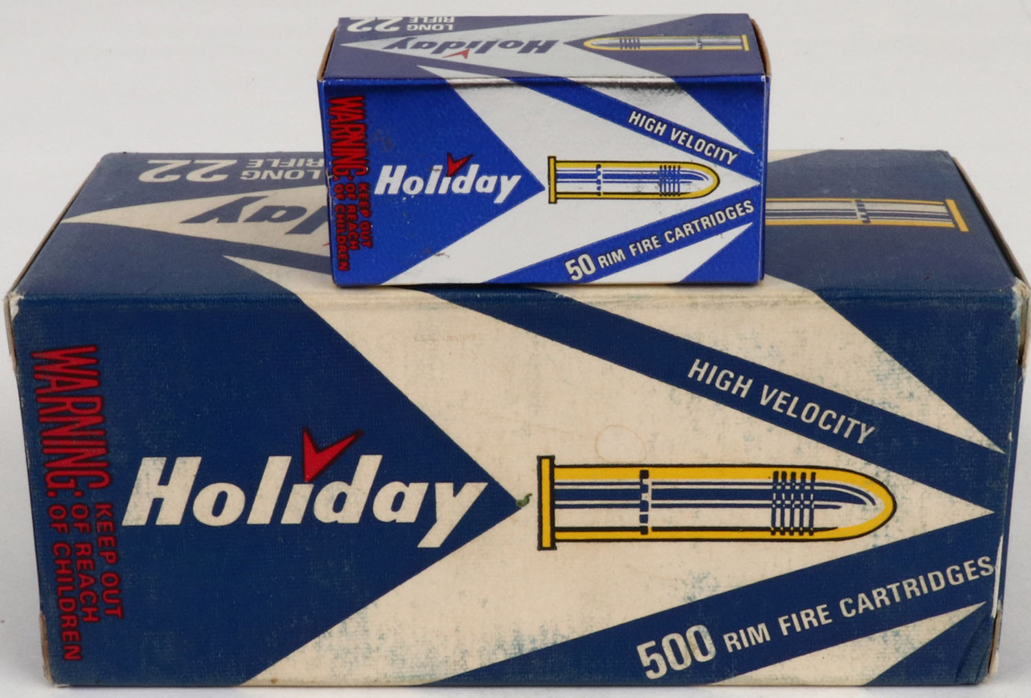 Holiday, .22 Long Rifle, High Velocity, Full, 500rs. 1pc. Blue & white brick, brick is solid with excellent color, minor shelf & corner wear, edges are crisp, end flaps are solid, inside boxes are minty. Grade: Excellent ++ - Value: 100 to 400