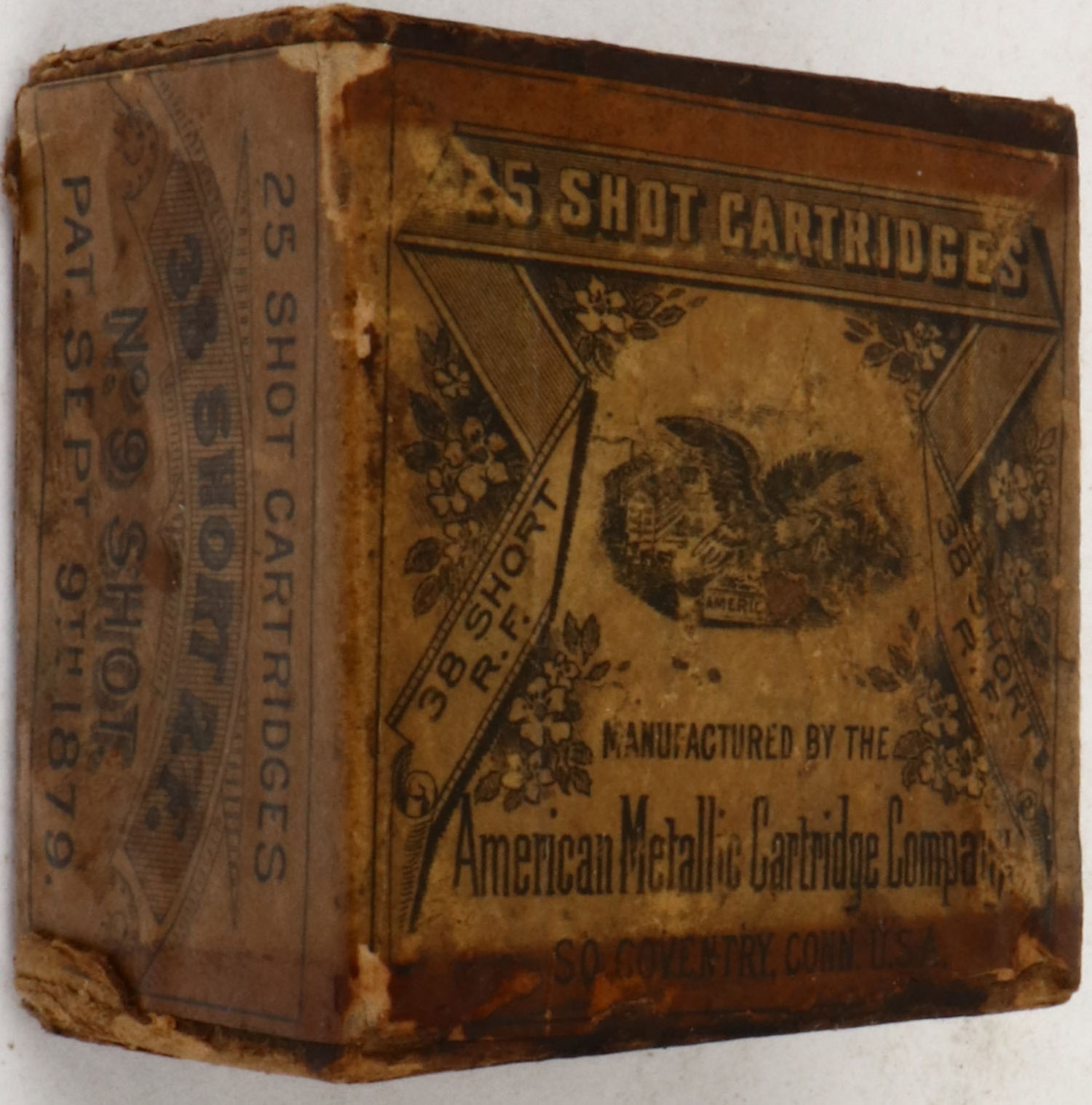 American Metallic Cartridge Co., .38 Short R.F. Shot Cartridges, Partial 14rds., 2pc. Brown box with buff labels, box is solid with very good color, age soiling, lid has 2 seam splits, some edge & corner wear, ammo is good. (724b) Grade: Very Good - Value: 10 to 100