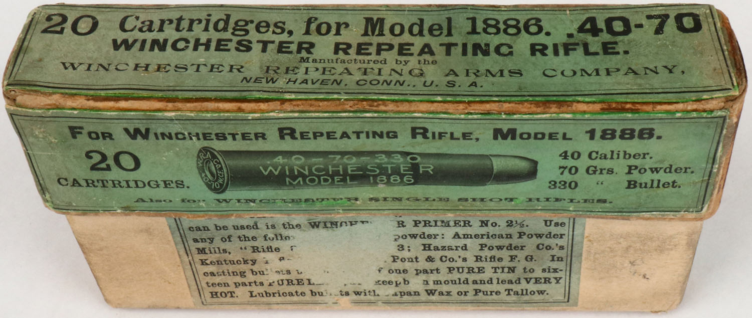 Winchester, .40-70-330, for model 1886, 2pc, Full, buff box with green label & black print, box is solid with excellent color, some age soiling, edge wear, scuff to front of box, partial seam split to left side of lid, left end has been written on, ammo is excellent. Grade: Excellent + - Value: 80 to 160