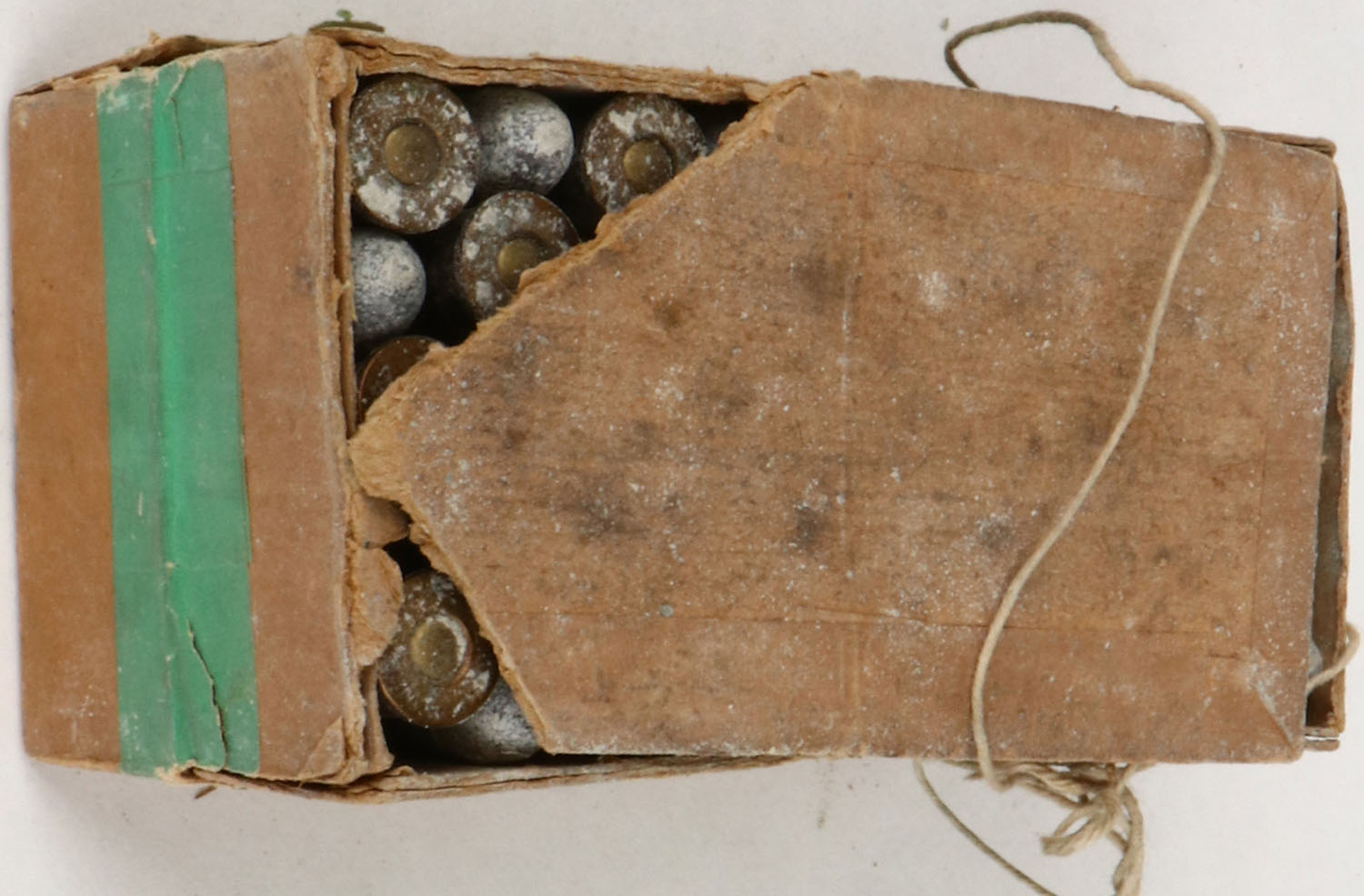 Winchester, 44 Long C.F., Central Fire Reloading, 2pc, Partial, buff box with green label & black print, box is weak with bottom of box dethatched, left end flap of lid had 2 seams split, rub marks & edge wear, ammo is fair with heavy corrosion. Grade: Good ++ - Value: 50 to 250