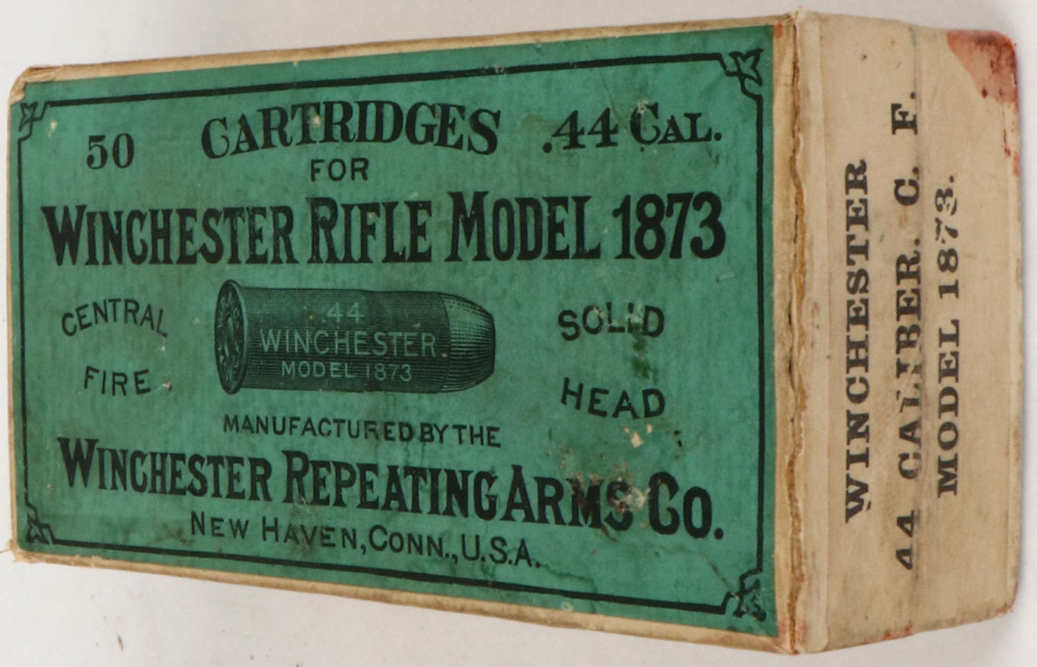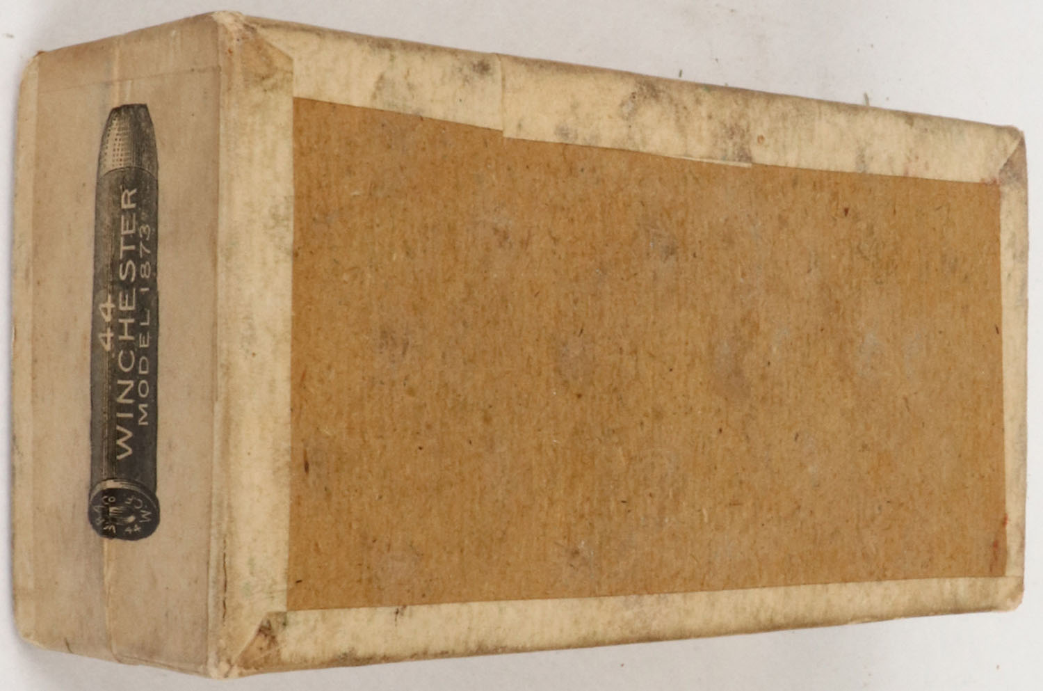 Winchester, .44 Cal Winchester Rifle Model 1873, Central Fire, solid head, 2pc, FULL & SEALED, buff box with green label & black print, box is solid with one split seam on bottom, age soiling, rub marks & light edge wear. Grade: Very Good ++ - Value: 300 to 900