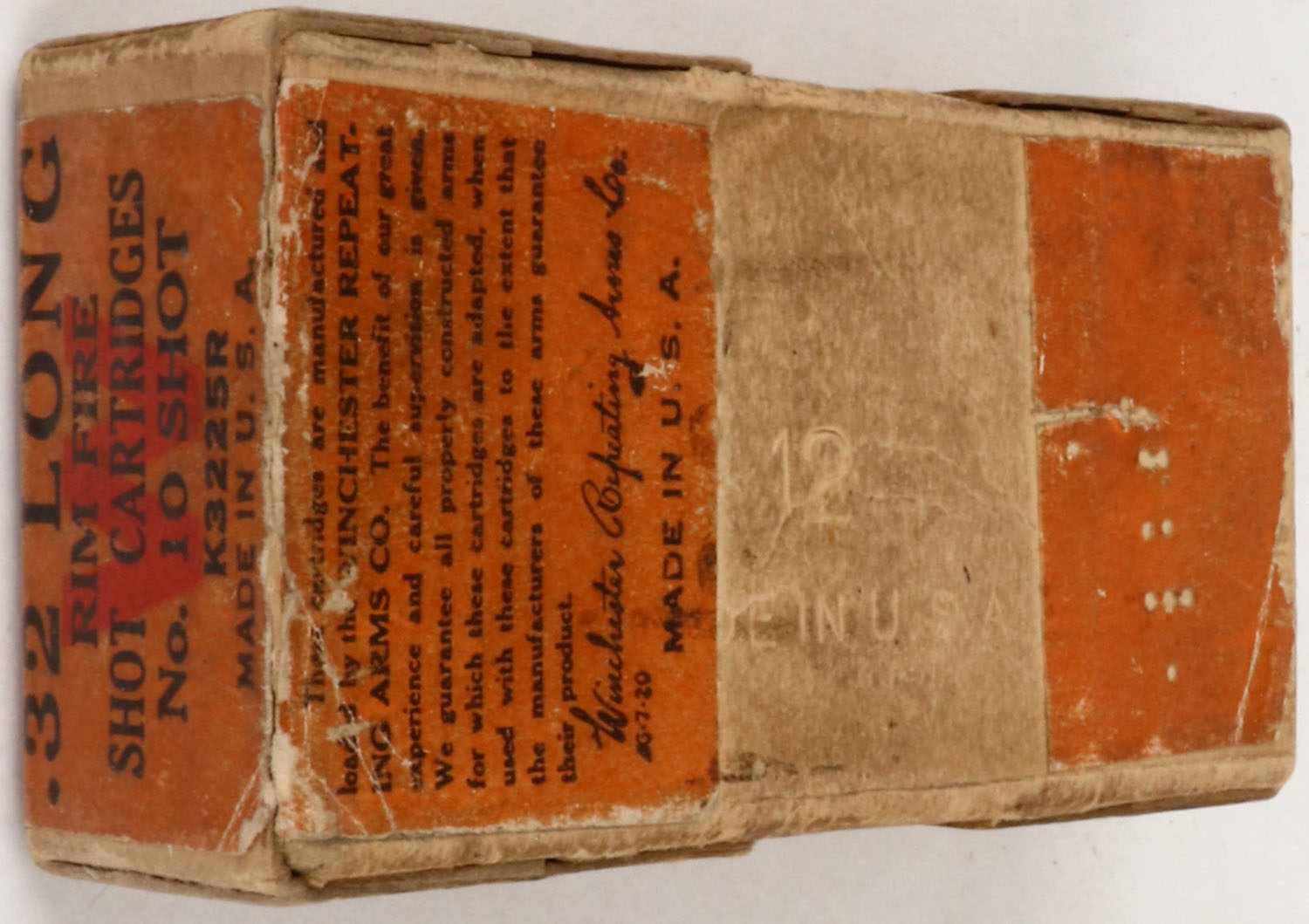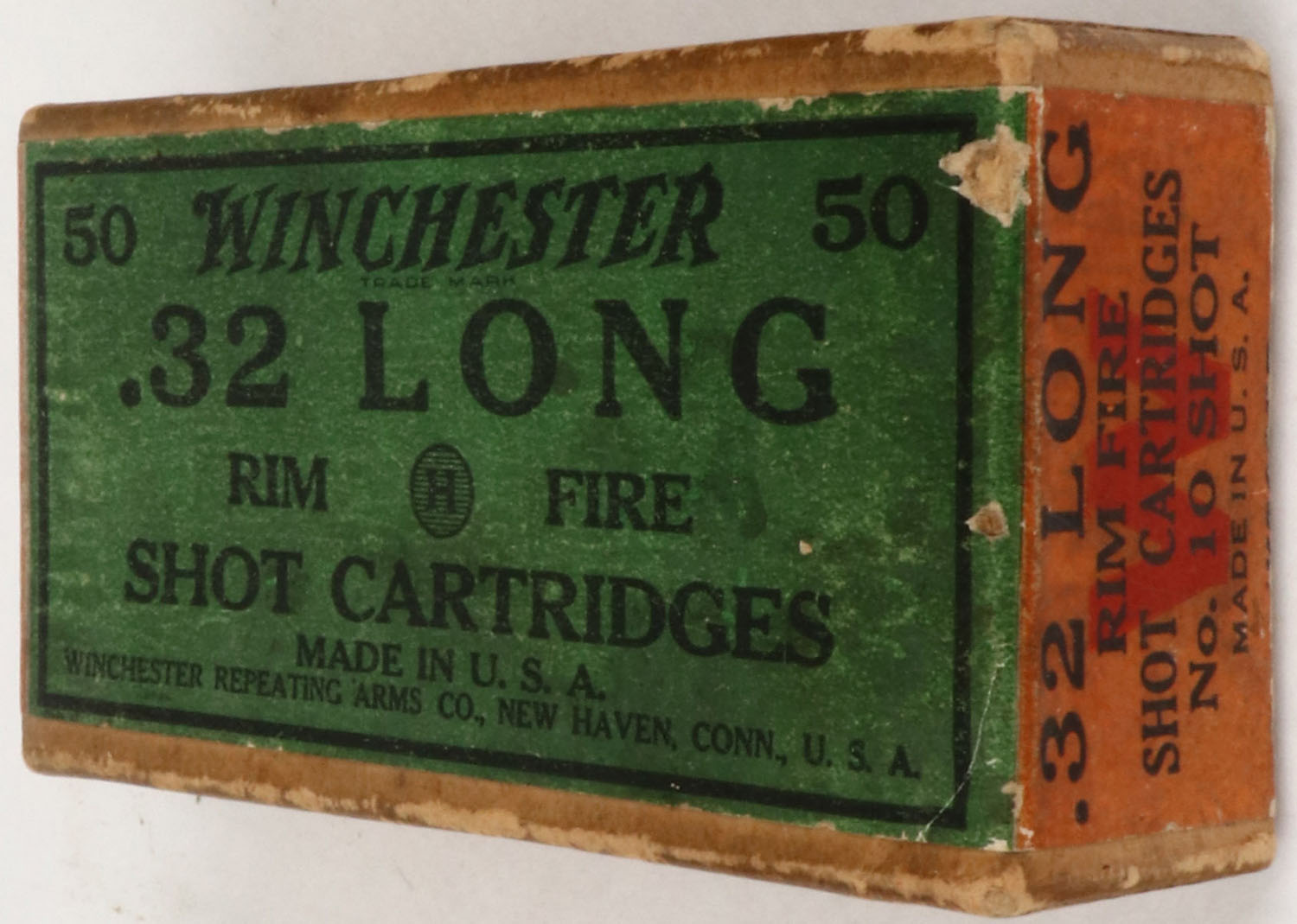 Winchester, .32 Long Rim Fire Shot Cartridges, Partial 30rds., 2pc. Buff box with green & orange wraparound label, box is solid with excellent color, some age soiling, minor edge & corner wear, labels are intact, ammo is excellent. (146) Grade: Very Good ++ - Value: 20 to 100