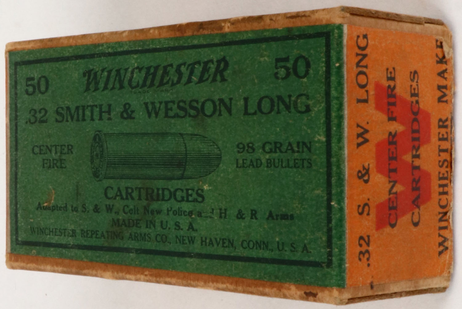 Winchester, .32 Smith & Wesson Long, Center Fire, 98 Grain Lead Bullet, Partial 36rds., 2pc. Buff box with green & orange wraparound label, box is solid with excellent color, some age soiling & edge wear, bottom has been written on, corners are mostly sharp, labels are intact, ammo is excellent. (1333) Grade: Excellent - Value: 20 to 100