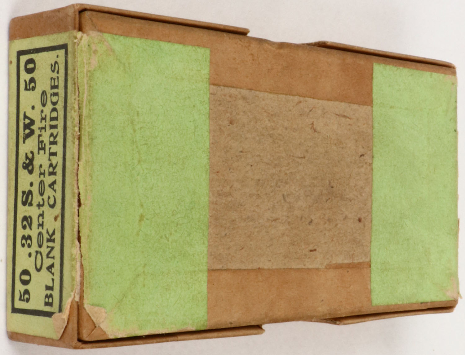 Winchester, .32 Caliber Smith & Wesson Blank Cartridges, Full, 2pc. Buff box with green wraparound label, box is solid with excellent color, edges are crisp, corners are sharp, labels are intact, ammo is excellent. (552) Grade: Excellent + - Value: 10 to 50