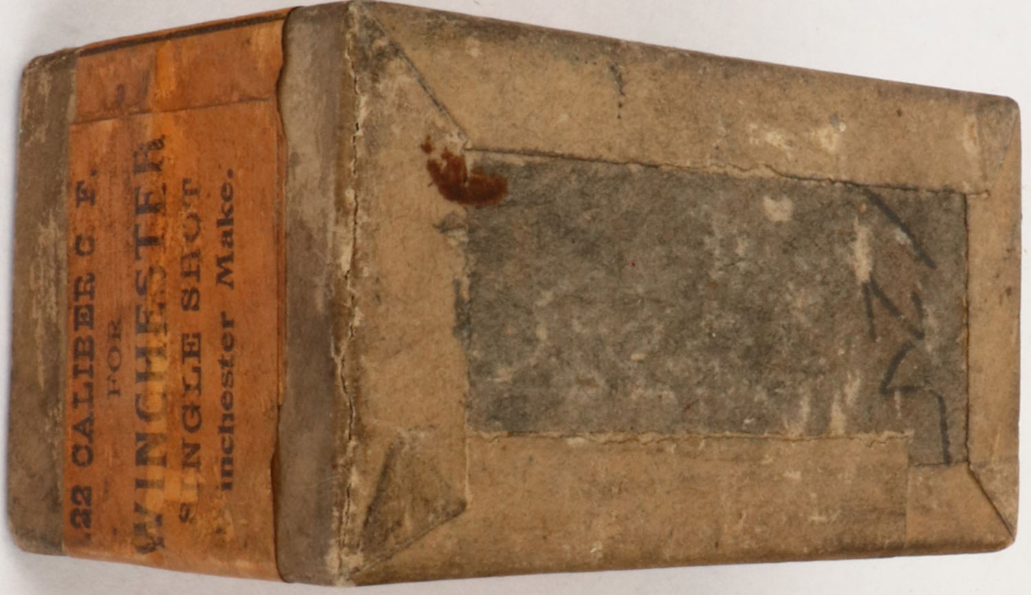 Winchester, Single Shot, .22 Caliber Center Fire, FULL & SEALED, 2pc. Buff box with green top & orange side sealing labels, box is solid with very good to excellent color, age soiling, very minor corner wear, edges are crisp, labels are intact. Grade: Excellent - Value: 50 to 250