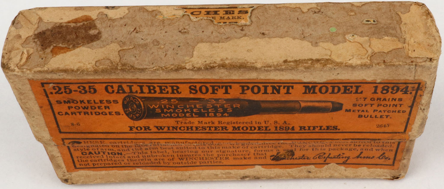 Winchester, .25-35 Caliber Soft Point Model 1894, Smokeless, 117 Grains Soft Point Metal Patched Bullet, Partial 19rds., 2pc. Buff box with orange labels, box is solid with excellent color, some age soiling, top label is almost completely gone, some edge wear, ammo is good to very good. (215) Grade: Very Good - Value: 50 to 150