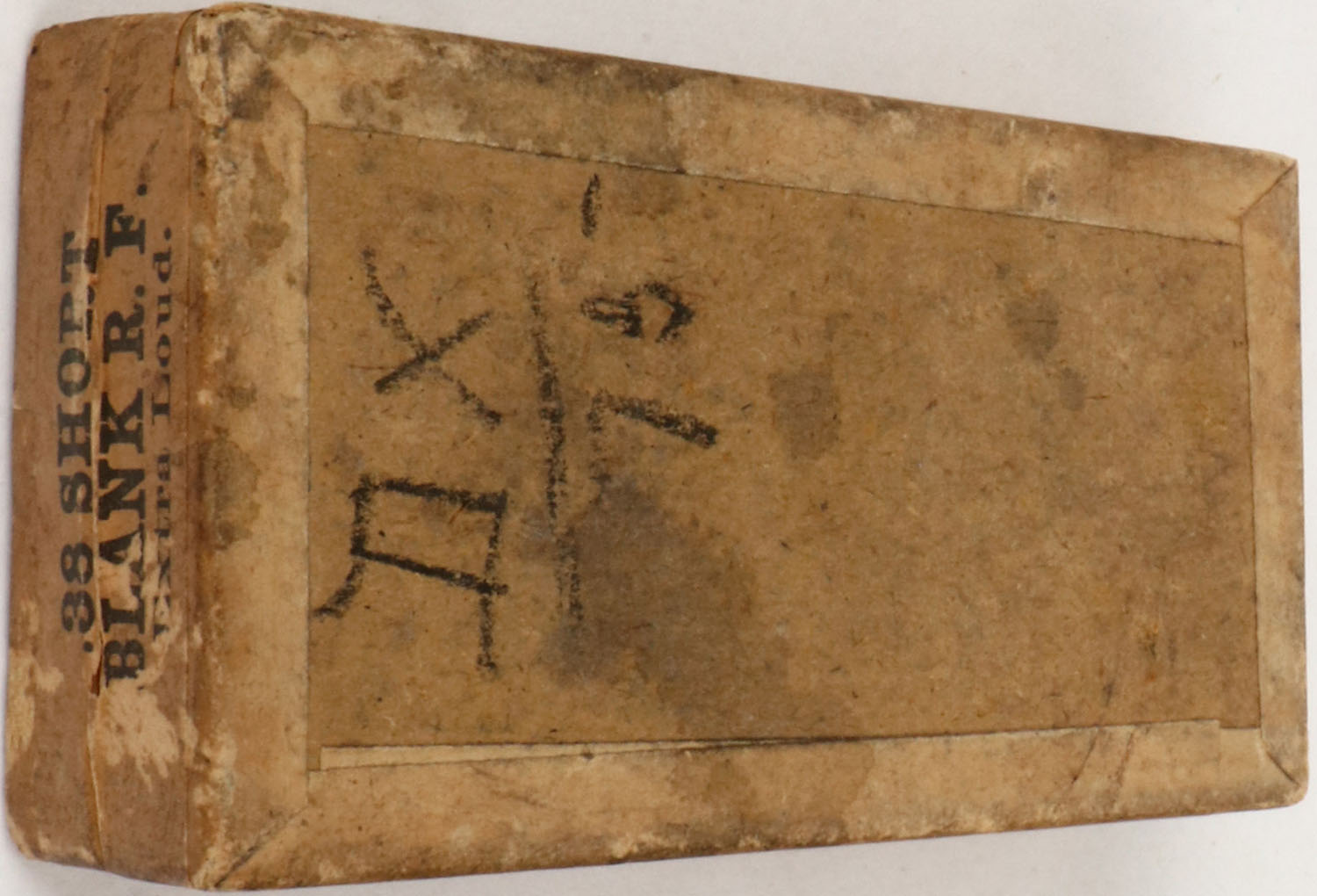Winchester, Blank Cartridges, .38 Caliber Short Rim Fire, Extra Loud, FULL & SEALED, 2pc. Buff box with buff top & side sealing labels, box is solid with very good to excellent color, age soiling, minor staining on top, very minor edge & corner wear, bottom has been written on, labels are intact. Grade: Very Good + - Value: 20 to 100