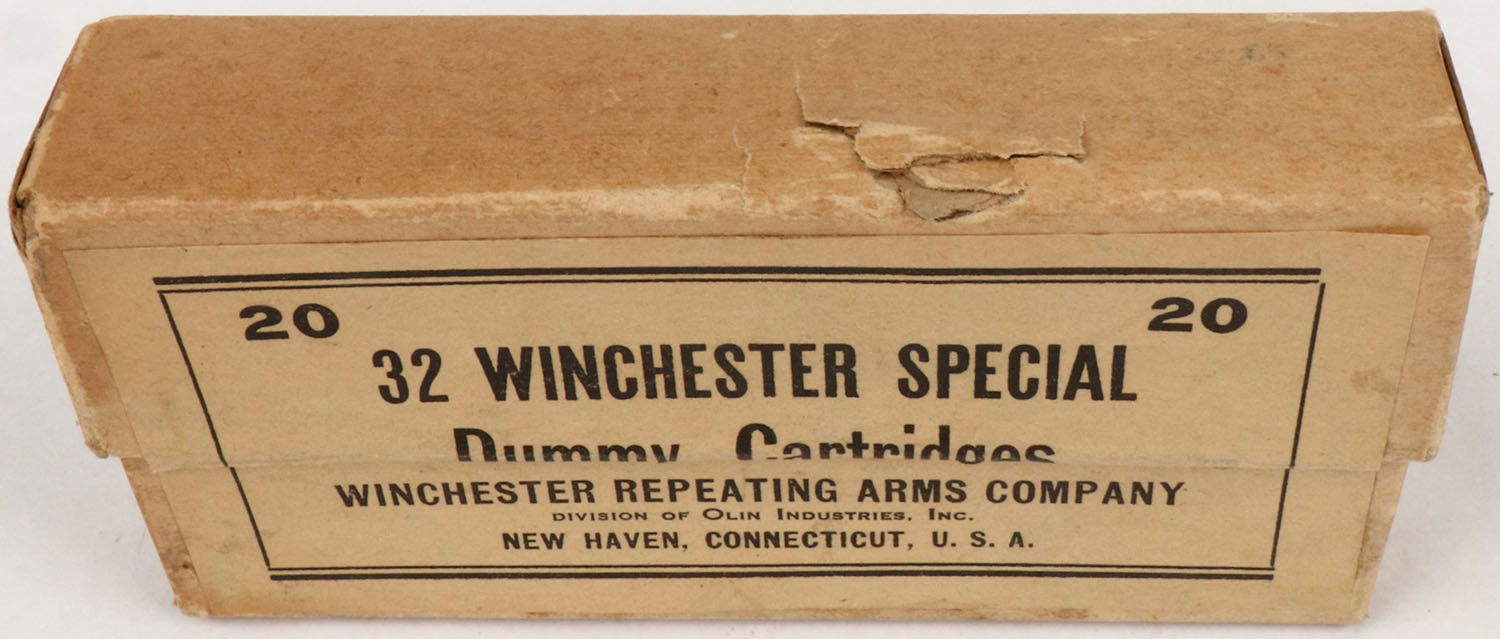 Winchester, .32 Winchester Special Dummy Cartridges, FULL & SEALED, 2pc. Buff box with buff label, box is solid with excellent color, very minor age soiling & edge wear, has a ding on top, label is intact. Grade: Excellent - Value: 10 to 50