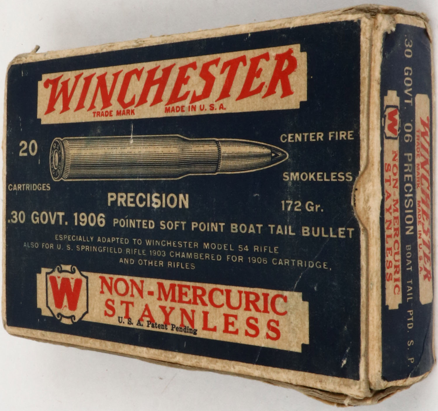 Winchester, Non-Mercuric Staynless, .30 Govt. 1906 (.30-06) Precision, Pointed Soft Point Boat Tail Bullet, Full, 1pc. Blue white & red box, box is solid with excellent color, some age soiling, minor edge & corner wear, end flaps are solid, ammo is excellent. Grade: Very Good ++ - Value: 30 to 60