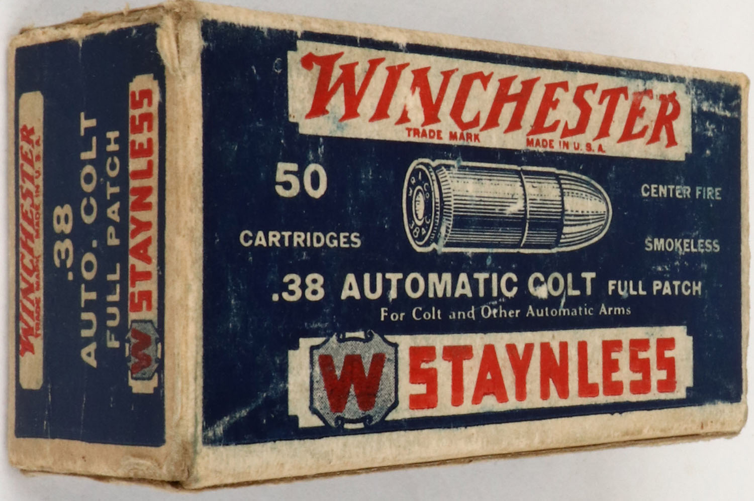 Winchester,. Staynless, .38 Automatic Colt, Full, 1pc., blue white & red box, box is solid with excellent color, very minor age soiling & shelf wear, very minor edge & corner wear, end flaps are solid, ammo is excellent. (1464) Grade: Excellent - Value: 20 to 60