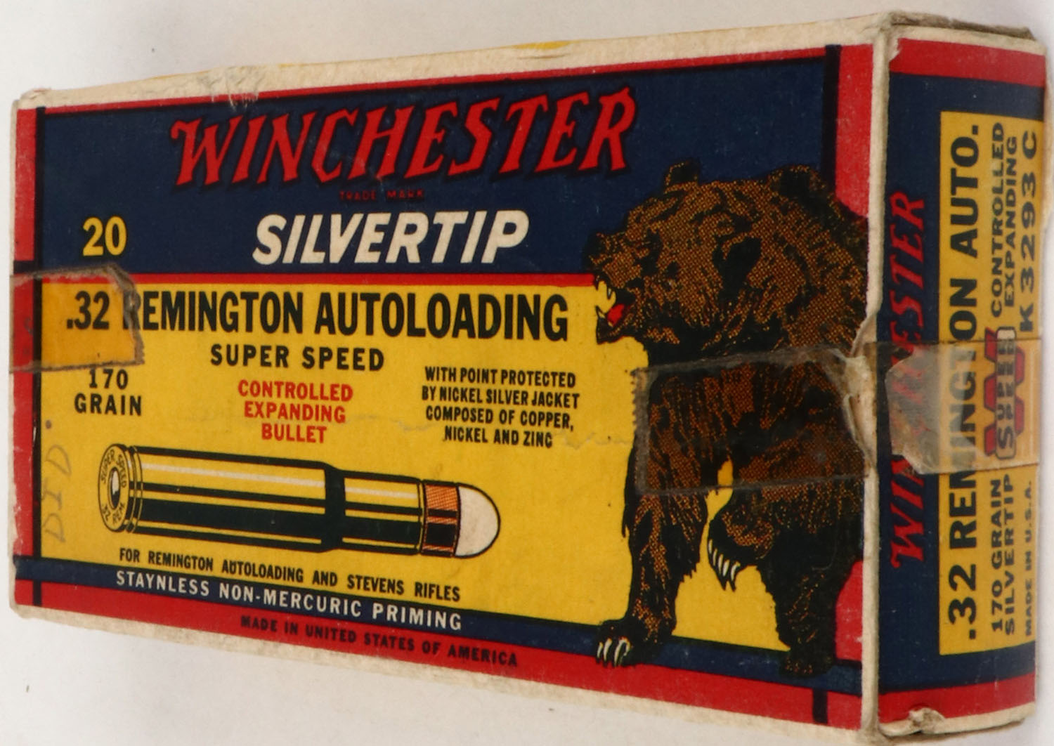 Winchester, Silvertip, .32 Remington Autoloading, 170 Grain Controlled Expanding Bullet, Full, 1pc. Yellow blue & red Bear Box, box is solid with excellent color, very minor age soiling, tape on both end flaps, top has been written on, some corner wear, very minor edge wear, end flaps are solid, ammo is excellent. Grade: Very Good ++ - Value: 20 to 80