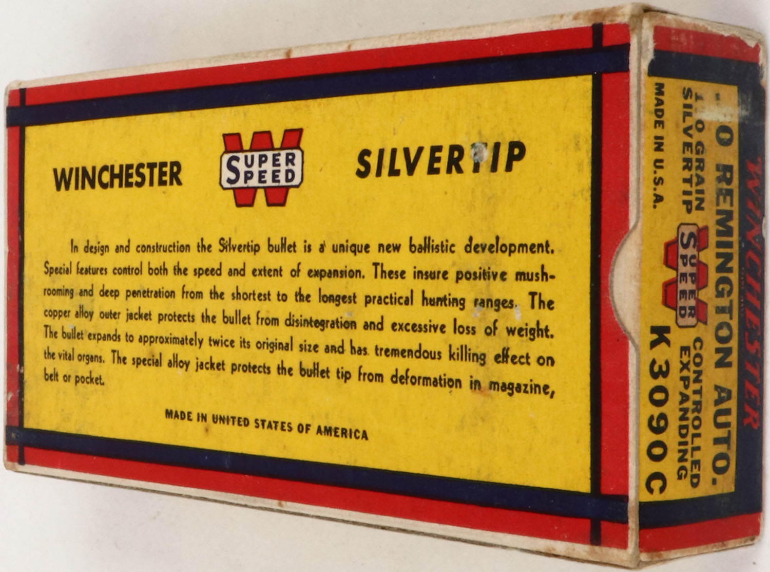 Winchester, Silvertip, .30 Remington Autoloading, 170 Grain Controlled Expanding Bullet, Full, 1pc. Yellow blue & red Bear Box, box is solid with excellent color, very minor age soiling & corner wear, some shelf wear, edges are mostly crisp, end flaps are solid, ammo is excellent. Grade: Excellent - Value: 100 to 300