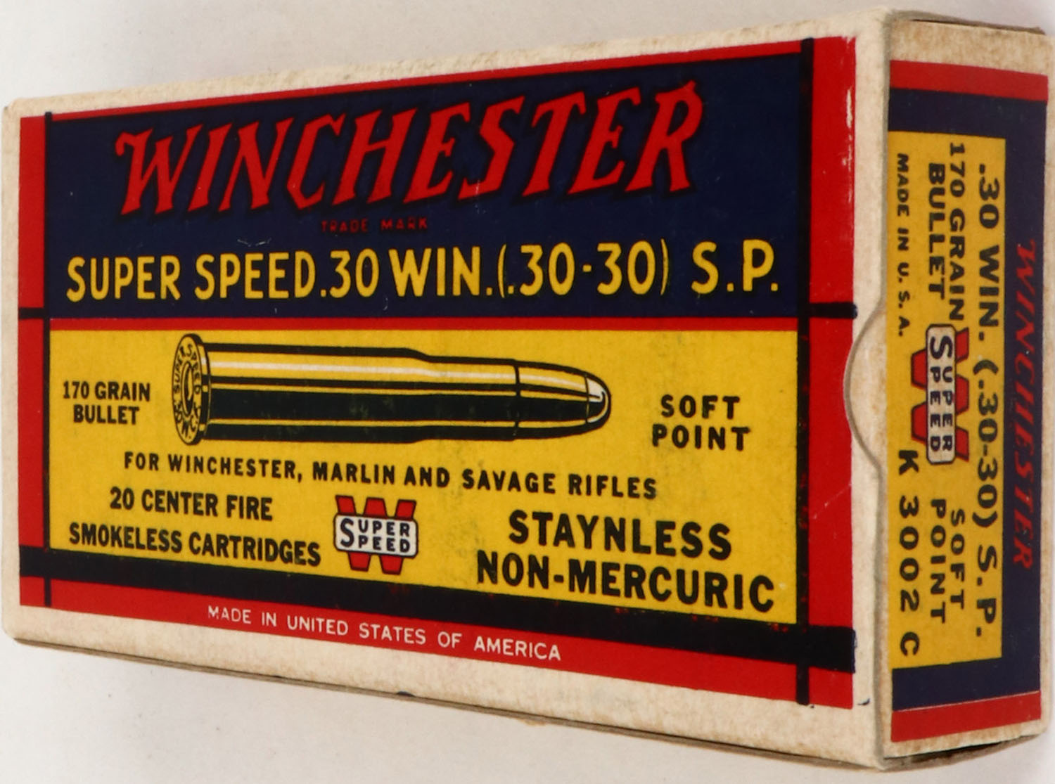 Winchester, Super Speed, .30 Win. (.30-30) S.P., 170 Grain Soft Point Bullet, Full, 1pc. Yellow blue & red box, box is solid with excellent to minty color, very minor age soiling, corners are mostly sharp, edges are crisp, end flaps are solid, ammo is excellent. Grade: Excellent + - Value: 50 to 150