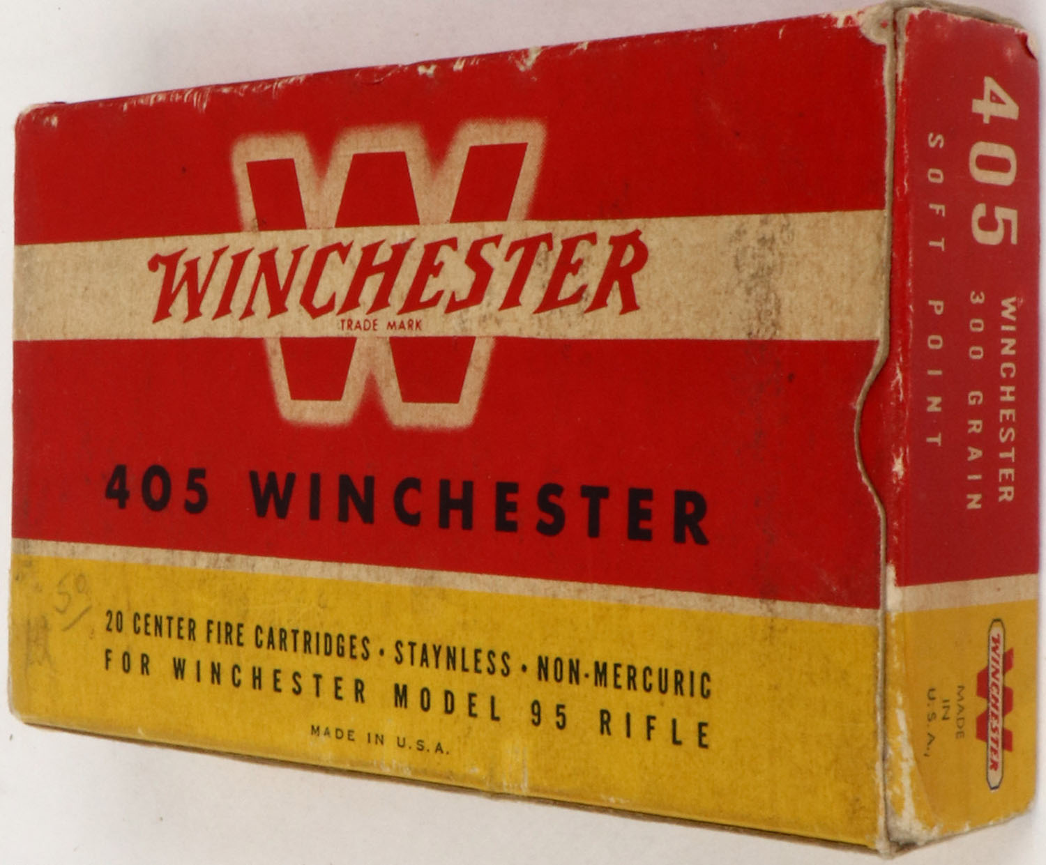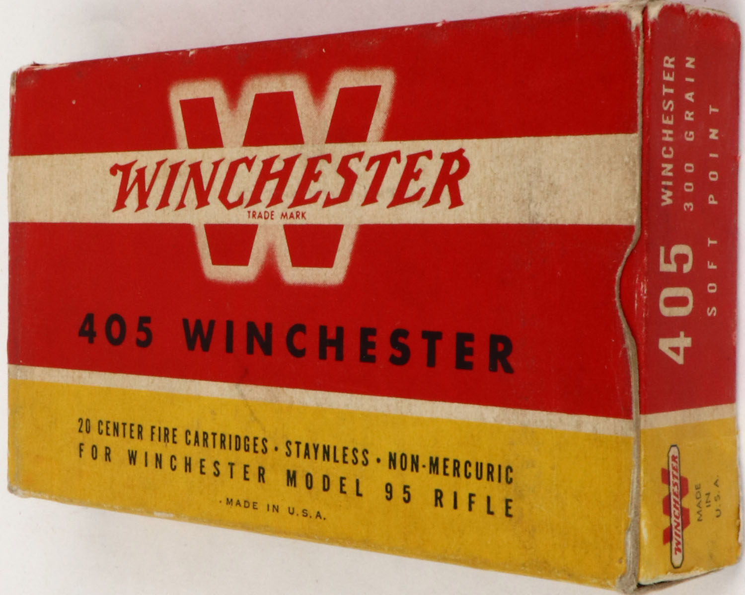 Winchester, .405 Winchester, 300 Grain Soft Point, Full, 1pc. Red yellow & white box, box is solid with excellent color, minor age soiling & corner wear, edge are crisp, end flaps are solid, bottom has been written on, ammo is excellent. Grade: Excellent - Value: 40 to 120