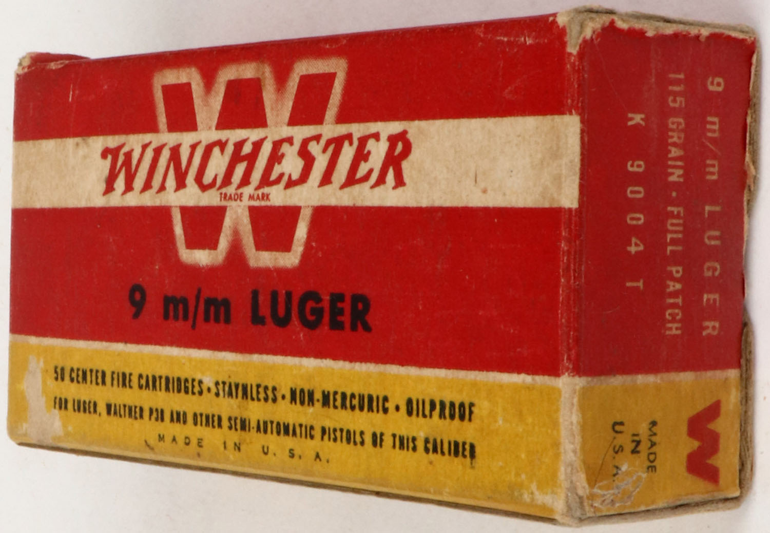 Winchester, 9mm Luger, 115 Grain Full Patch, Partial 45rds. 1pc. Red yellow & white box, box is solid with very good to excellent color, age soiling, very minor edge & corner wear, end flaps are solid, ammo is excellent. (141) Grade: Very Good ++ - Value: 10 to 40