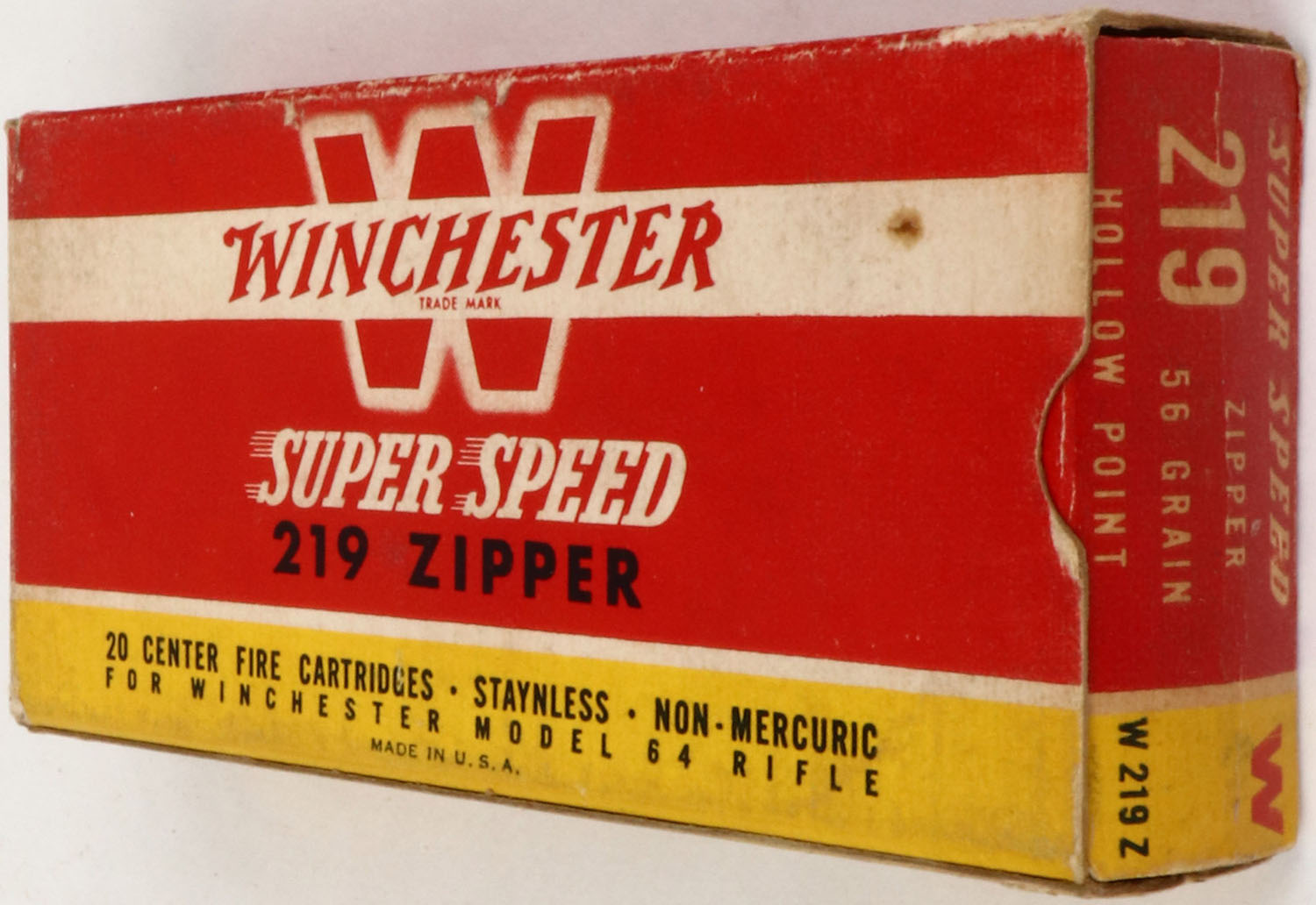 Winchester, Super Speed, .219 Zipper, 56 Grain Hollow Point, Full, 1pc. Red yellow & white box, box is solid with excellent color, some age soiling, minor edge & corner wear, small stain on top, end flaps are solid, ammo is excellent to minty. Grade: Excellent - Value: 100 to 200