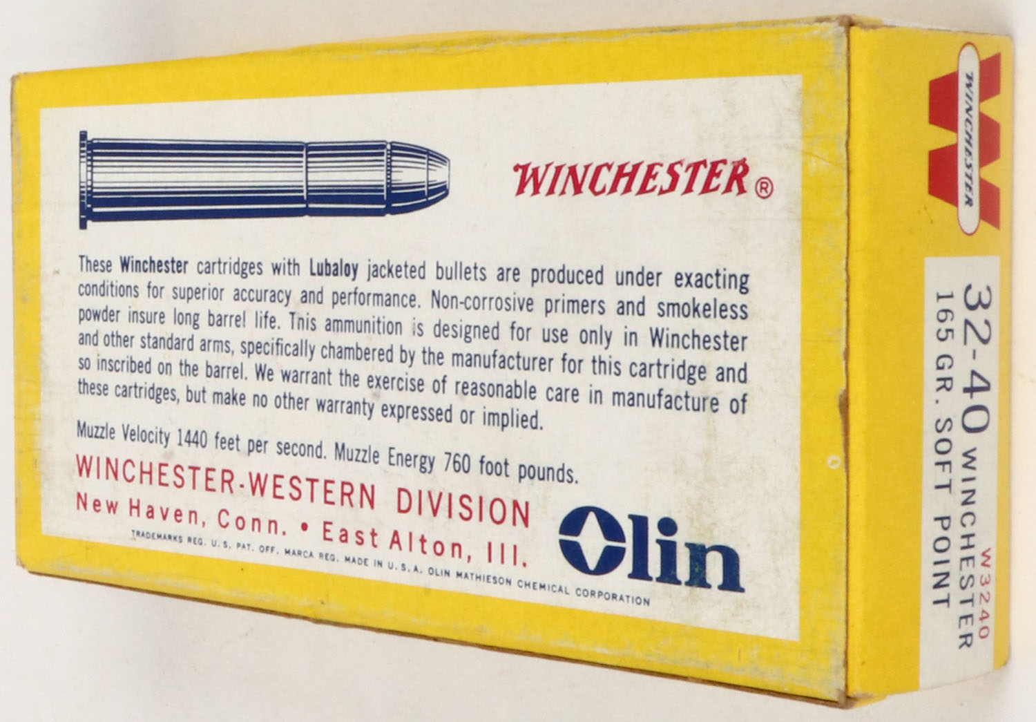 Winchester, .32-40 Winchester, 165 Grain Soft Point, Full, 1pc. Yellow white & red box, box is solid with excellent color, very minor corner wear, edges are crisp, top has been written on, end flaps are solid, ammo is excellent. Grade: Excellent + - Value: 20 to 60