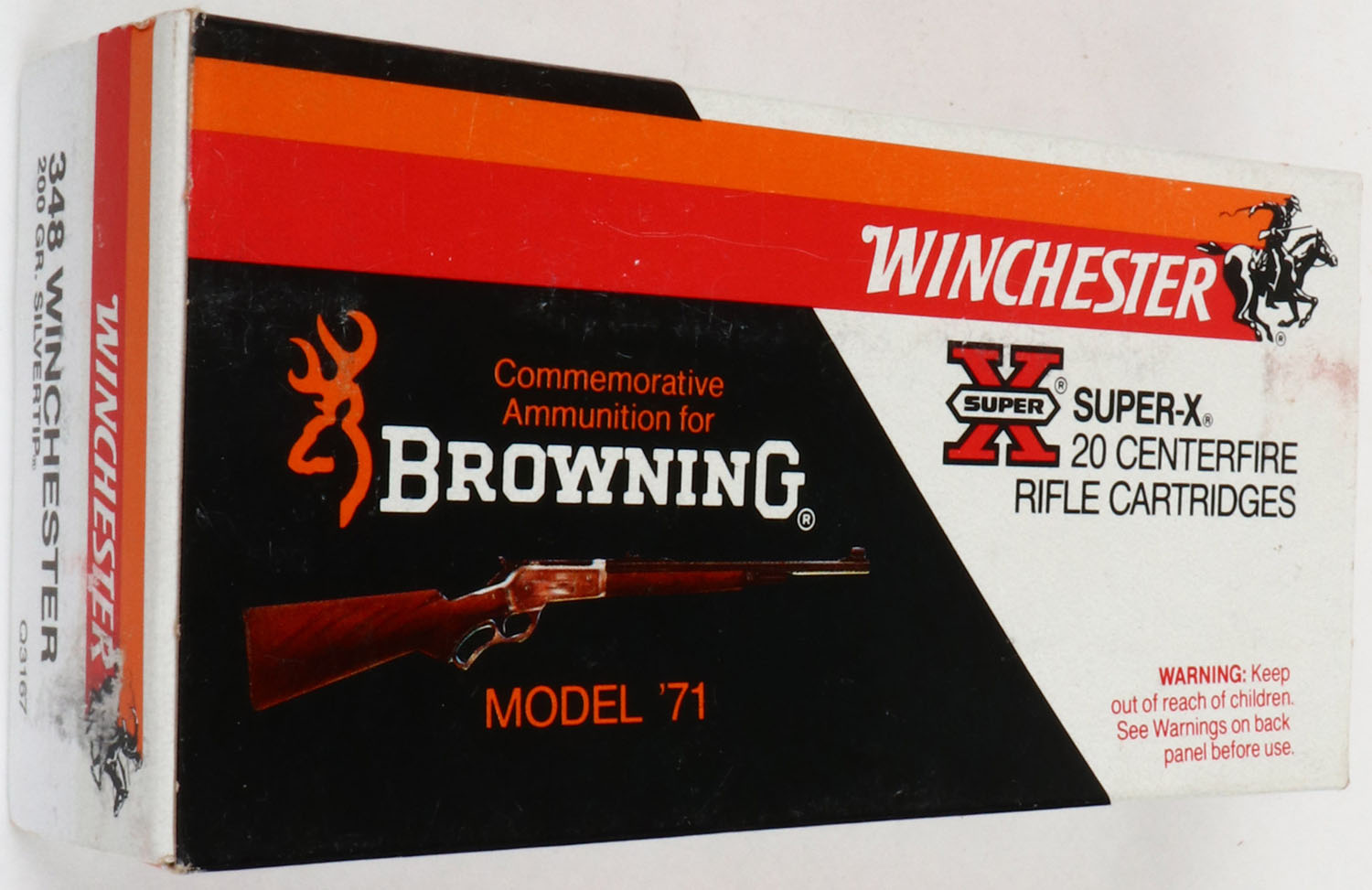 Winchester, Super-X, Commemorative Ammunition for Browning Model '71, .348 Winchester, 200 Gr. Silvertip, Full, 1pc. White black & red box, box is solid with excellent color, very minor shelf & corner wear, edges are crisp, end flaps are solid, ammo is excellent. Grade: Excellent + - Value: 40 to 120
