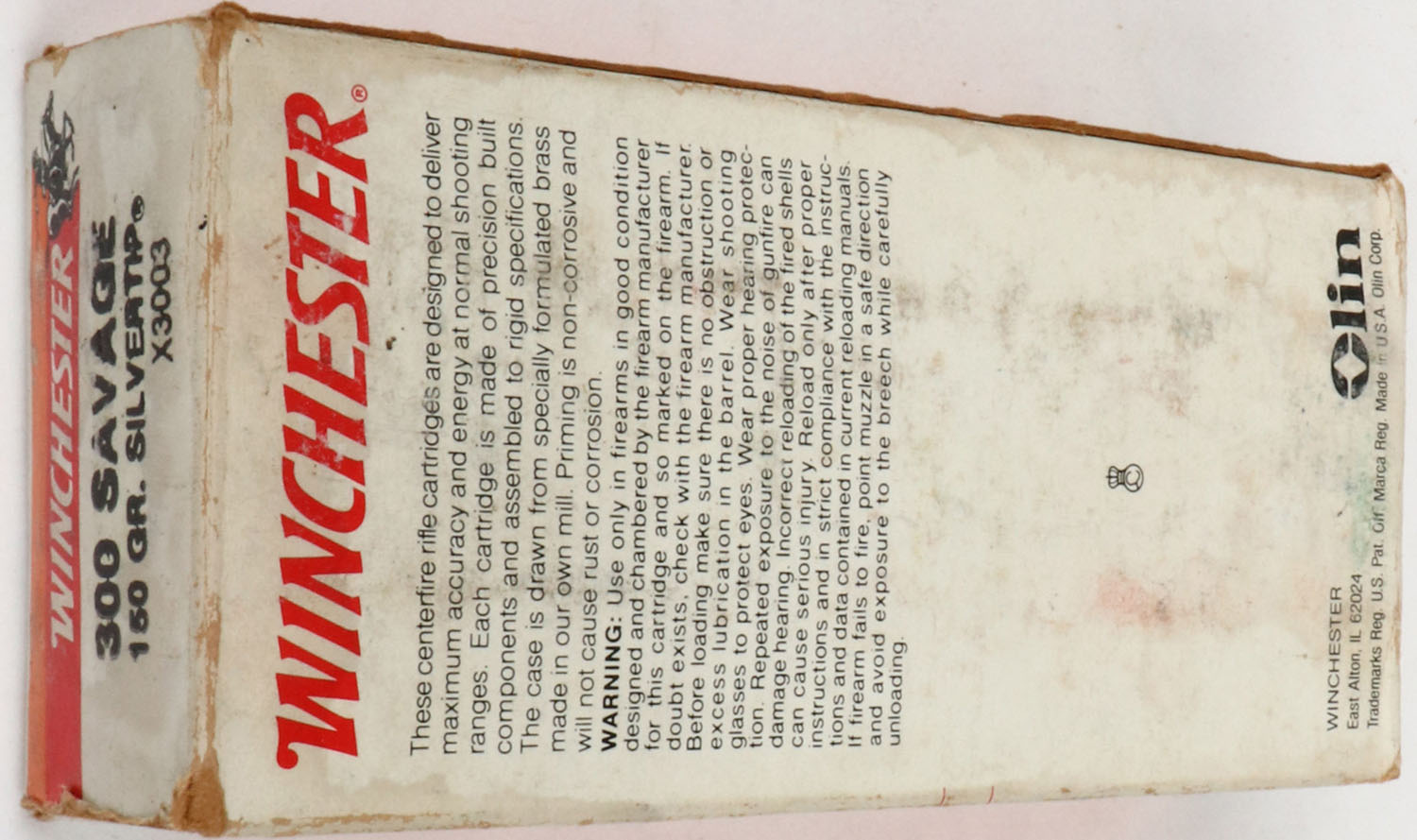 Winchester, Super-X, .300 Savage, 150 Gr. Silvertip, Full, 1pc. White red & orange box, box is solid with very good to excellent color, age soiling, staining, some edge & corner wear, end flaps are solid, ammo is excellent. Grade: Very Good ++ - Value: 20 to 80