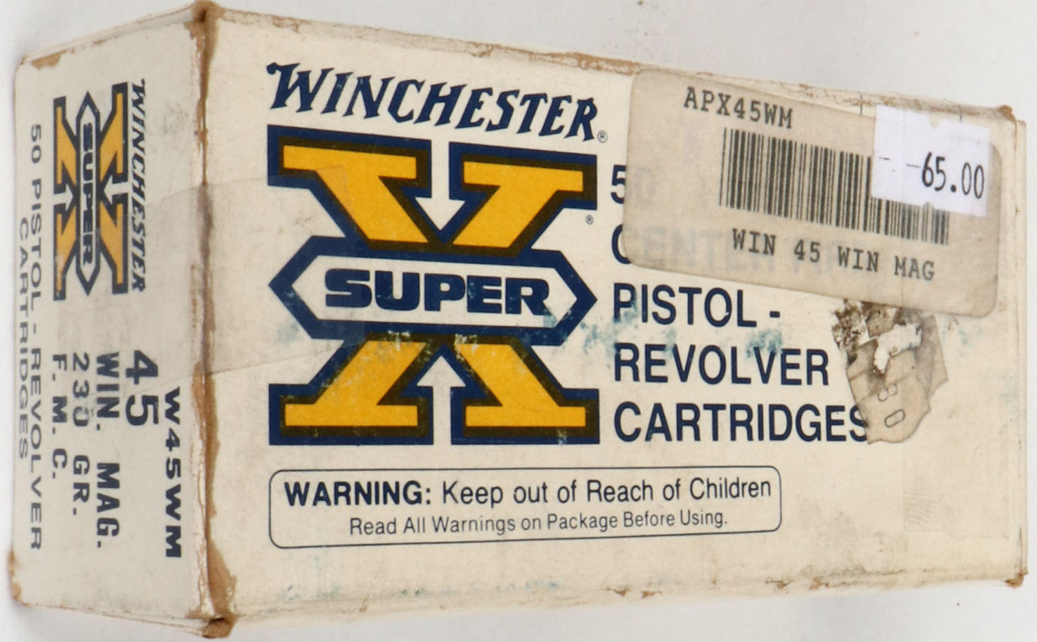 Winchester, Super X, .45 Win. Mag., 230 Gr. F.M.C., Partial 49rds., 1pc. White orange & blue box, box is solid with very good color, very minor age soiling, price stickers on top, some edge & corner wear, end flaps are solid, ammo is excellent to minty. Grade: Very Good ++ - Value: 20 to 80