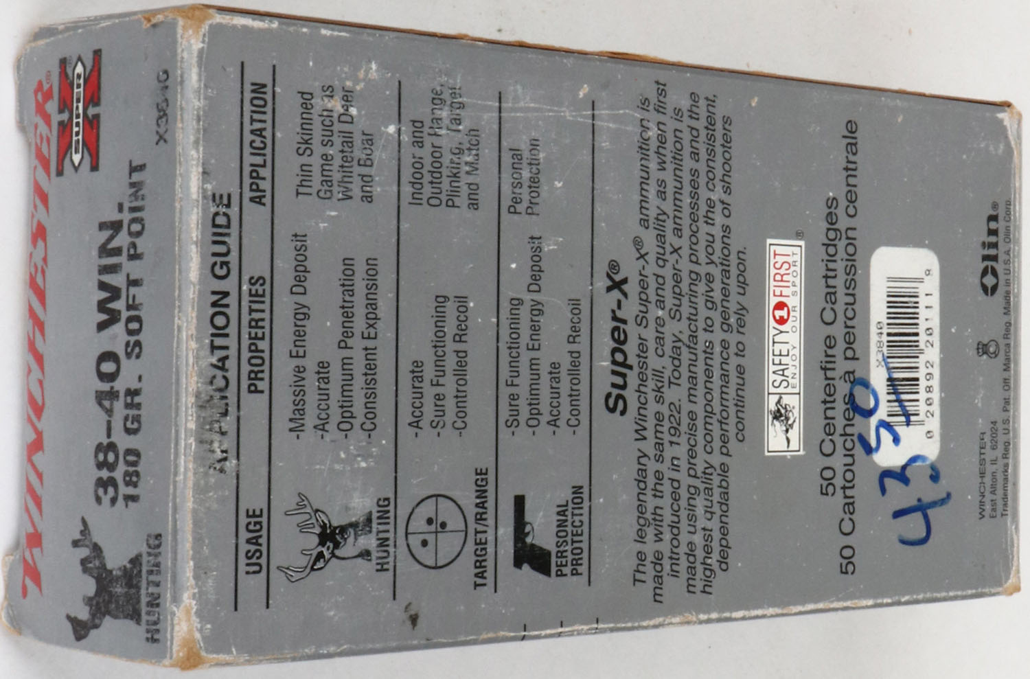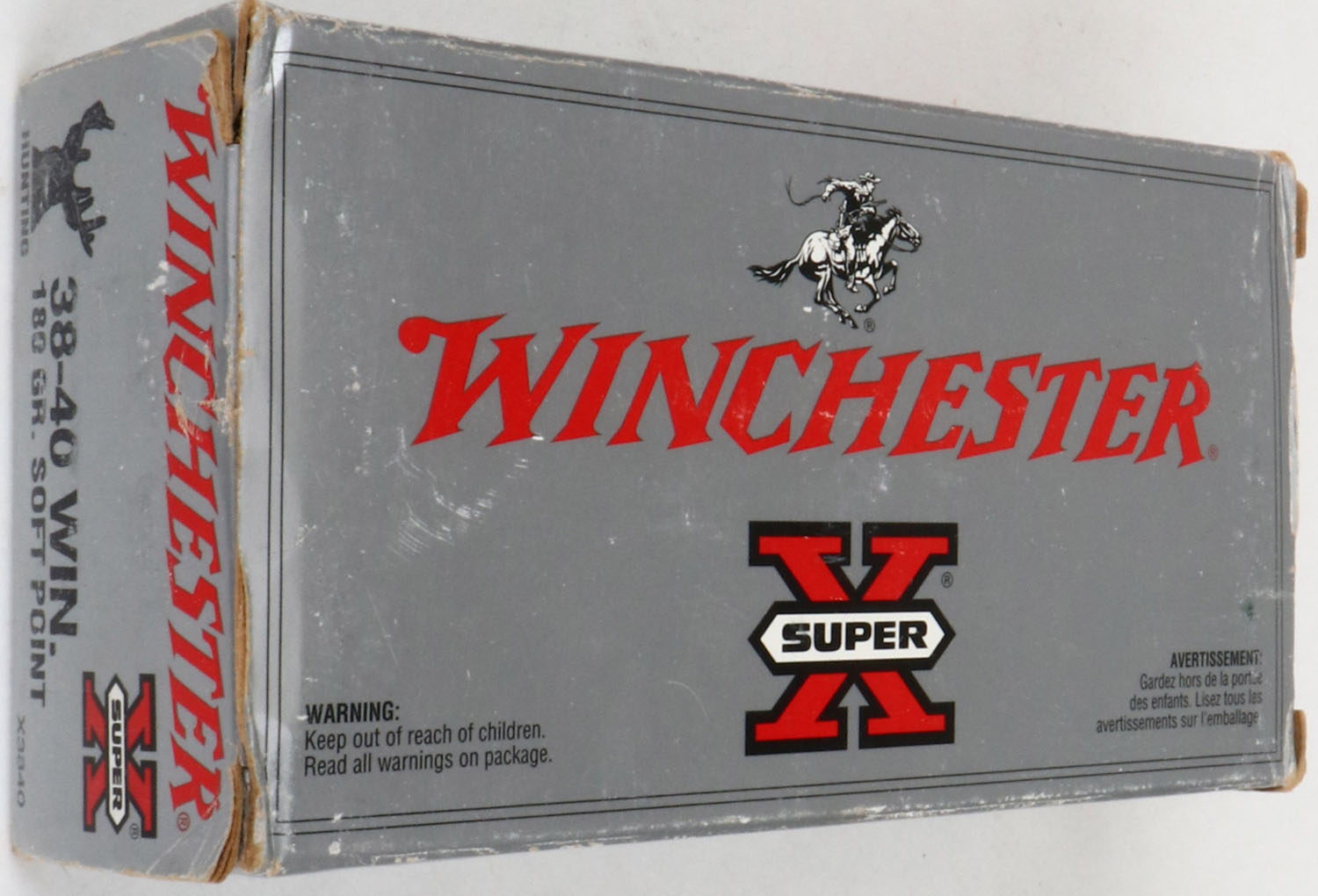Winchester, Super X, .38-40 Win., 180 Gr. Soft Point, Full, 1pc. Silver & red box, box is solid with excellent color, minor shelf & corner wear, very minor edge wear, end flaps are solid, ammo is excellent to minty. Grade: Excellent - Value: 40 to 80