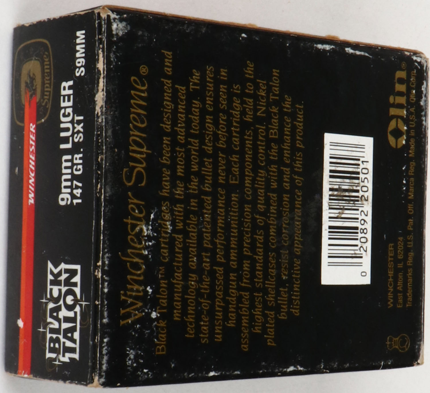 Winchester, Black Talon, 9mm Luger Hollow Point, 147 Gr. SXT, Full, 1pc. Black red & orange box, box is solid with excellent color, very minor shelf wear, very minor edge & corner wear, end flaps are solid, ammo is minty. Grade: Excellent - Value: 10 to 50