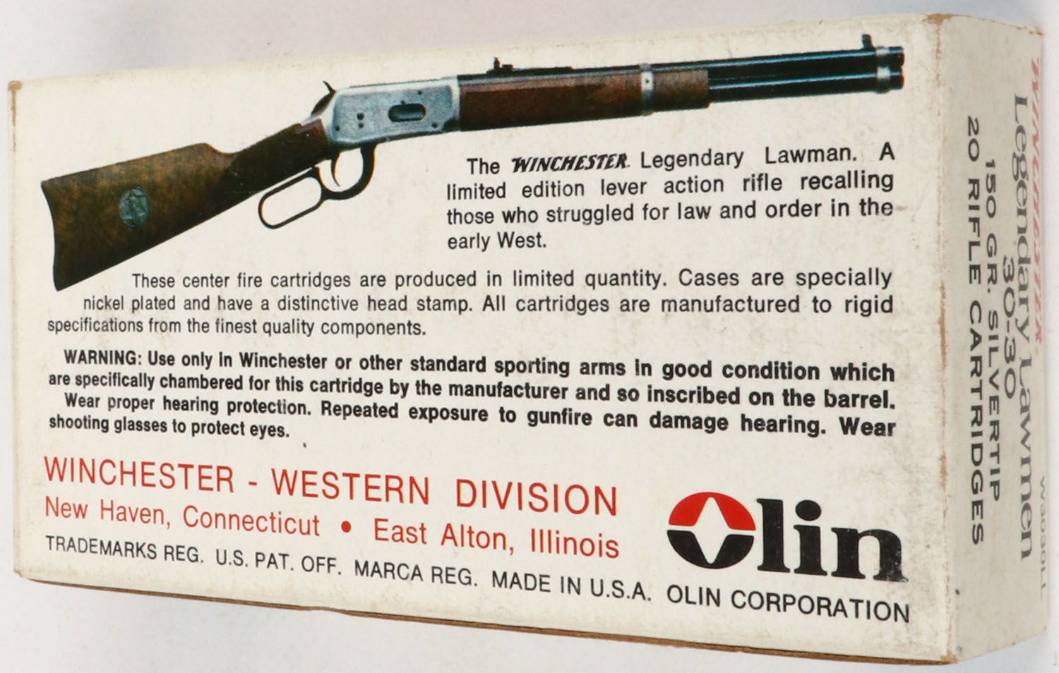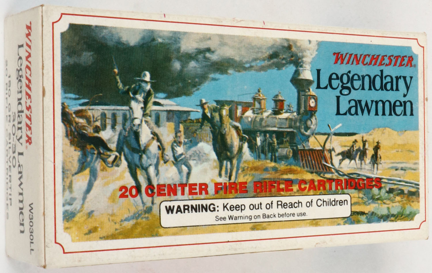 Winchester, Legendary Lawmen, .30-30 Win., 150 Gr. Silvertip, Full, 1pc. Multicolored box with French over label on front, box is solid with excellent color, very minor age soiling, corners are sharp, edges are crisp, end flaps are solid, ammo is excellent to minty. Grade: Excellent + - Value: 40 to 80
