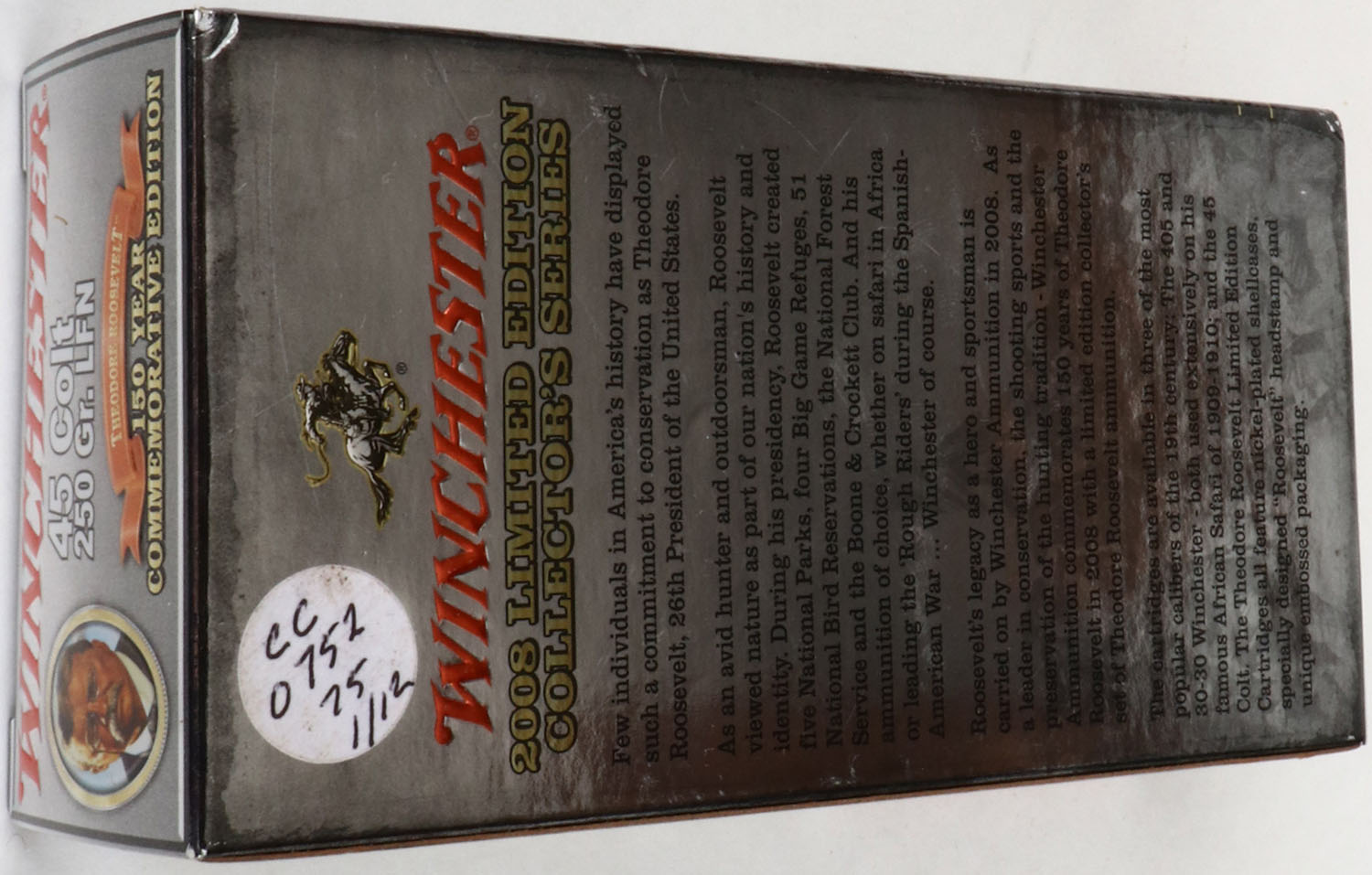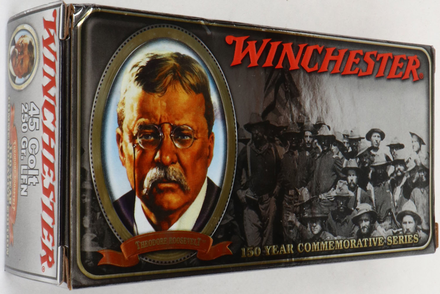 Winchester, Theodore Roosevelt 150 Year Commemorative Series, .45 Colt, 250 Gr. LFN, Full, 1pc. Silver box featuring the 26th president, box is near mint with excellent to minty color, only very minor shelf wear, sticker on bottom, corners are sharp, edges are crisp, end flaps are solid, ammo is excellent to minty. Grade: Excellent ++ - Value: 50 to 150