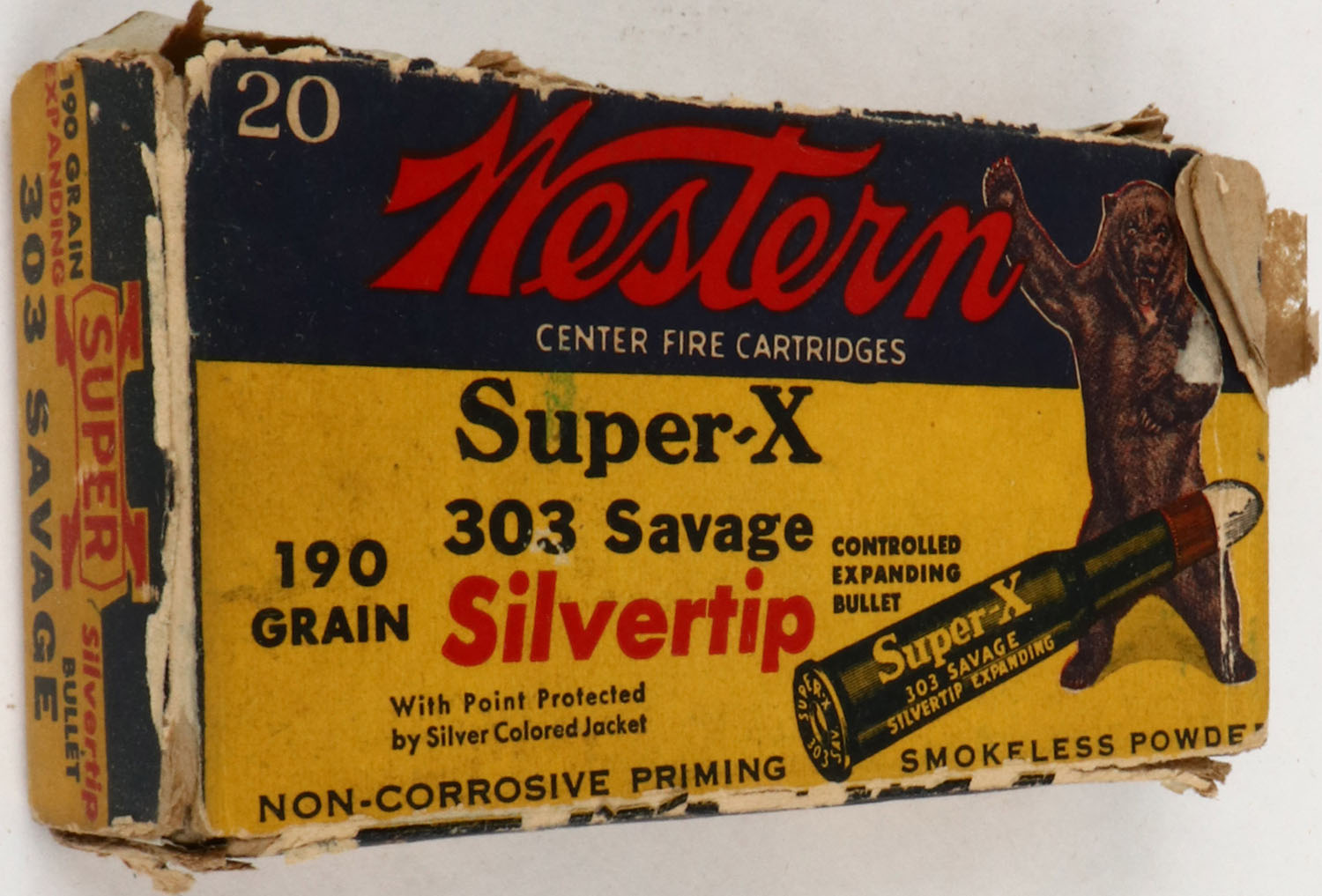 Western, Super-X, .303 Savage, 190 Grain Silvertip Bullet, Full, 1pc. Yellow blue & red Bear Box, Back is torn off and taped, right end flap is torn, edge & corner wear, box has excellent color with some age soiling, ammo is excellent. Grade: Fair + - Value: 20 to 60