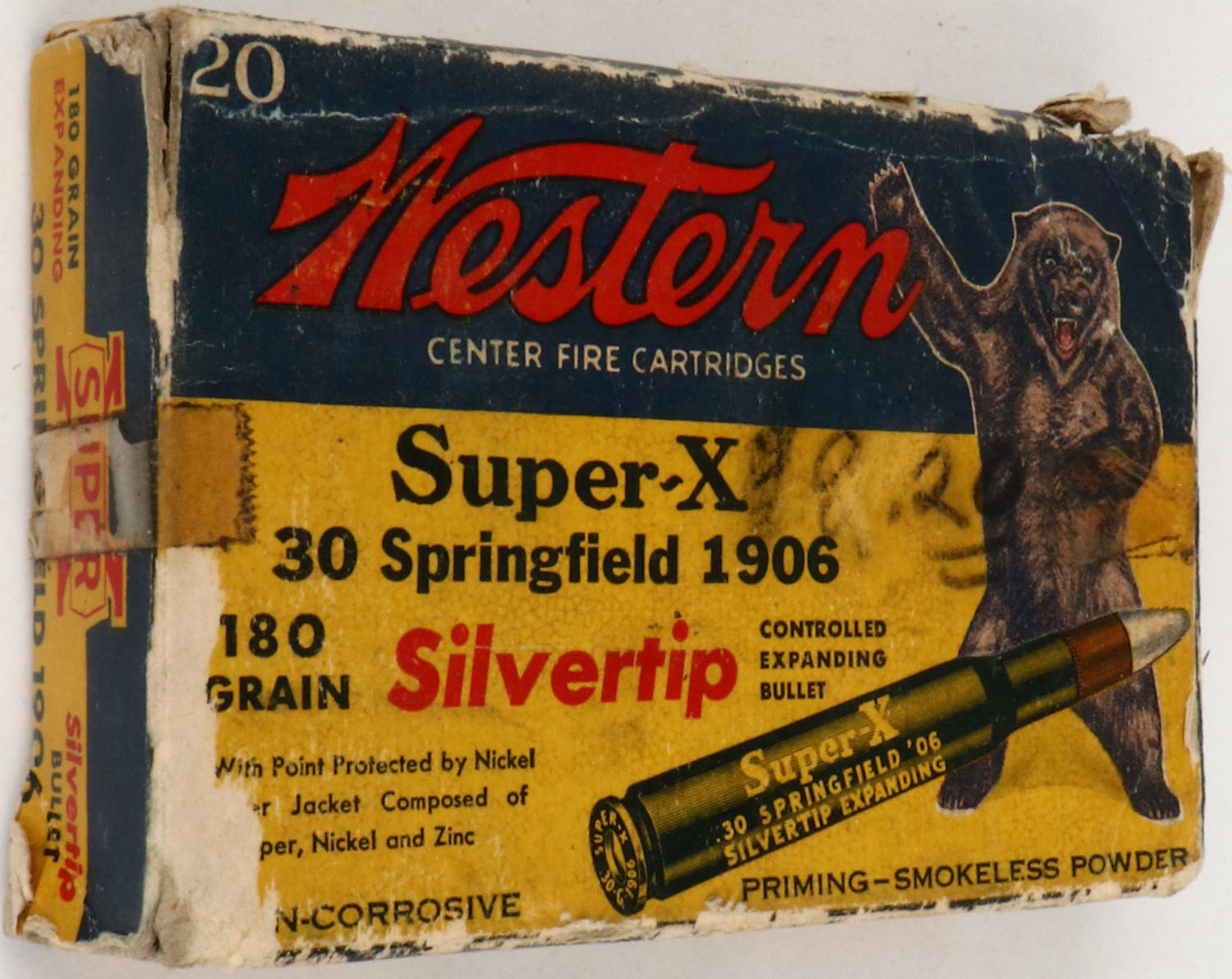 Western, Super-X, .30 Springfield 1906 (.30-06), Full, 1pc. Yellow blue & red Bear Box, box is solid with very good to excellent color, age soiling, hole on back right side, partial tear to right end flap, shelf wear, edge & corner wear, end flaps are mostly solid, top has been written on, ammo is excellent. Grade: Good + - Value: 10 to 50