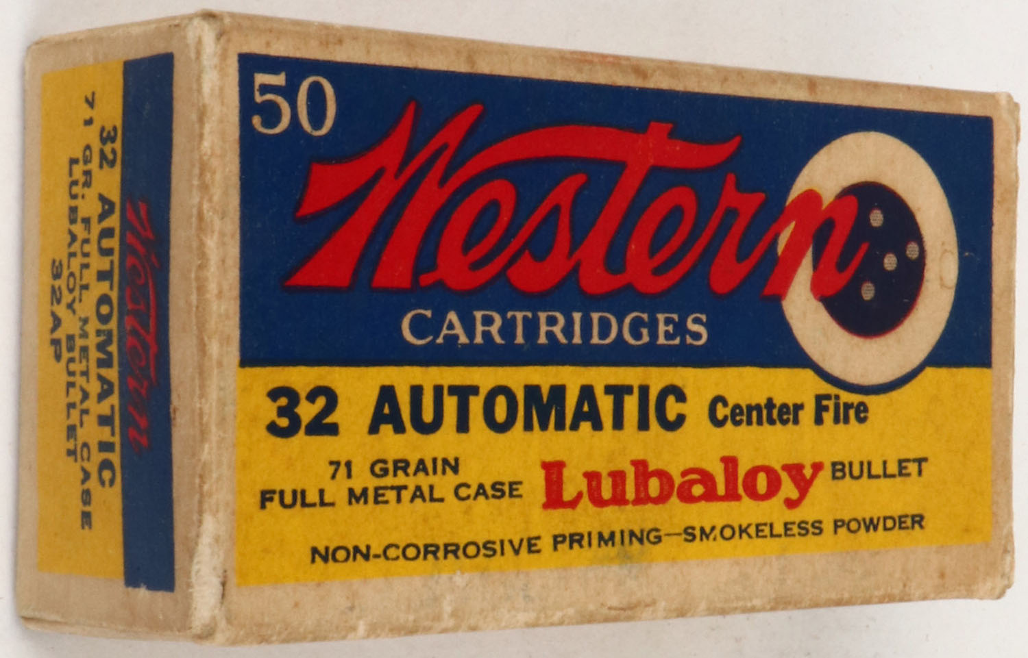 Western, .32 Automatic, 71 Grain Lubaloy Bullet, Full of mixed H/S, 1pc. Blue yellow & red bulls eye box, box is solid with excellent color, very minor age soiling, very minor edge & corner wear, end flaps are solid, ammo is excellent. (1520) Grade: Excellent - Value: 10 to 50